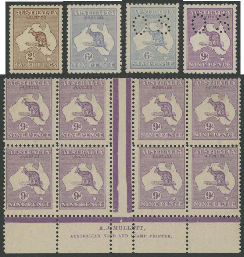 Die II x2 & Die IIB, 1/- Die II & Die IIB x2, 2/- brown (tiny hinge thin) & 2/- maroon, also 2d Die I Watermark Inverted, 2d Die IIA marginal block of 8 */** from the upper-left corner of the sheet with White Flaw below 'AU' of 'AUSTRALIA' [Pos