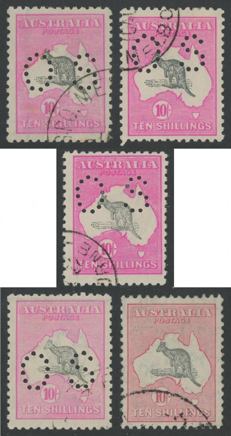 Kangaroo's Tail Clipped (unlisted) x3 and Kangaroo Slightly Misplaced Upwards (Ears in Timor Sea), also 10/- grey & pale aniline pink ACSC 48E CTO x9 plus CofA Wmk 10/- grey & pink commercially used, many noted as ex Stuart Hardy, generally fine to