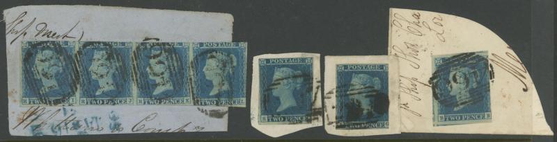 handstamp on piece Dungannon to Dublin; Plate 6 superb large stamp tied by bright red Maltese Cross to large-part entire with 'CAMPDEN/NO27/1840' cds alongside plus another on entire from Brechin to Arbroath; and Plate 9 stamp [QH] plus matching 1d