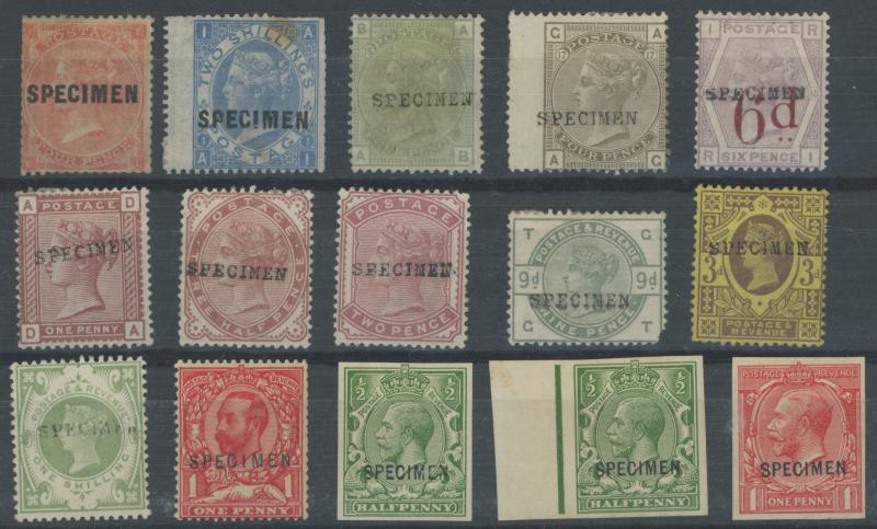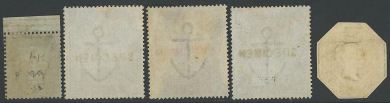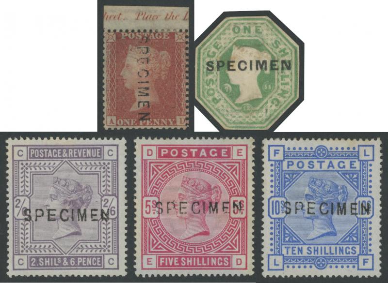 'SPECIMEN' Handstamps and Overprints including Stars 1d with part-marginal inscription (large-part gum), Embossed 1/- (cut-to-shape