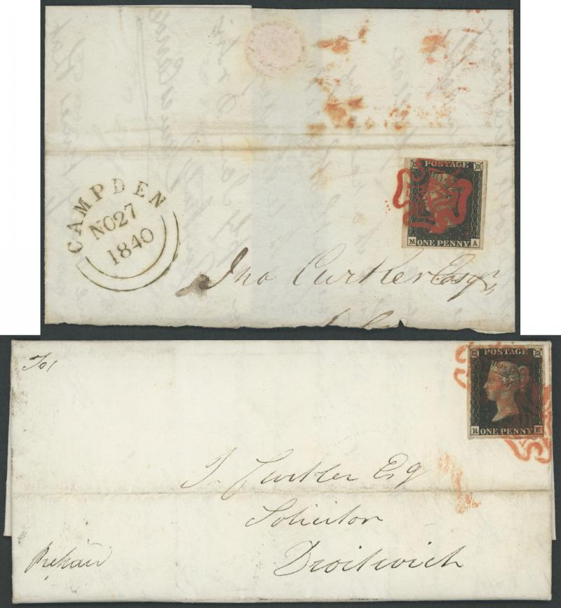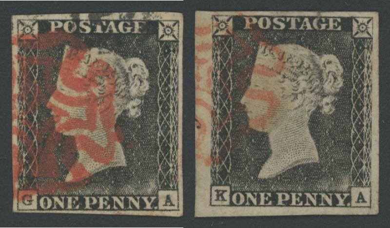 black, plus 1d red-brown from black plates SG 7 Plate 11 [HL] (margins close to huge at right with vertical watermark line) with light virtually complete Maltese Cross cancel in black, Cat £4630. A very attractive matched-letter duo. (2) (Image1) (Image2)