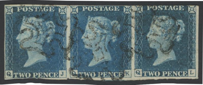 1840 QV Line-Engraved Tuppence Blue 2d blue SG 5 horizontal strip of 3 [QJ-QL], margins just clear to good except where just shaved