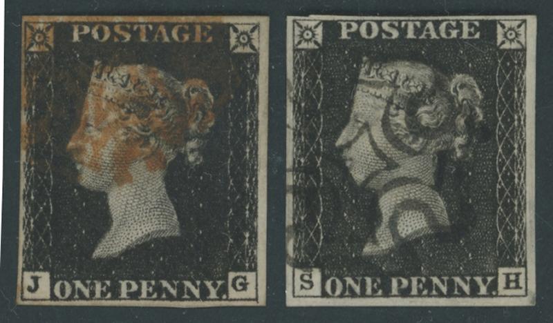 1840 QV Line-Engraved Penny Black 1d intense black SG 1 [JG] and 1d black SG 2 [SB], both with full mostly even margins, the former