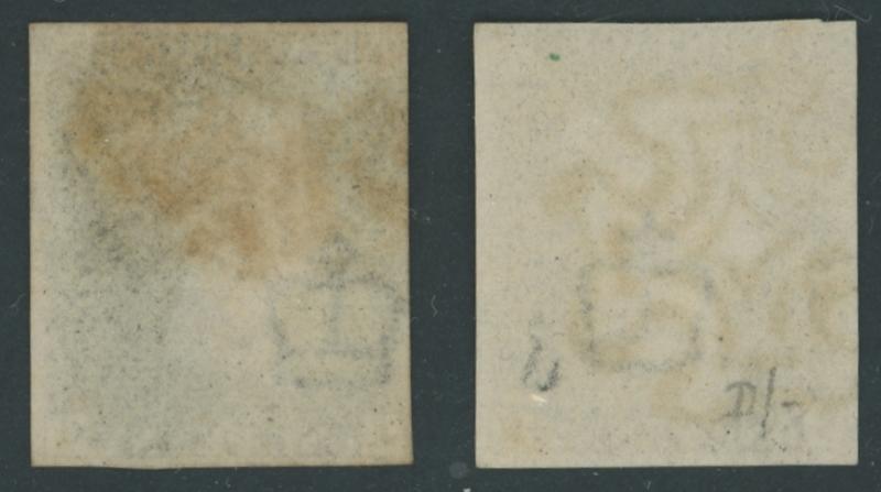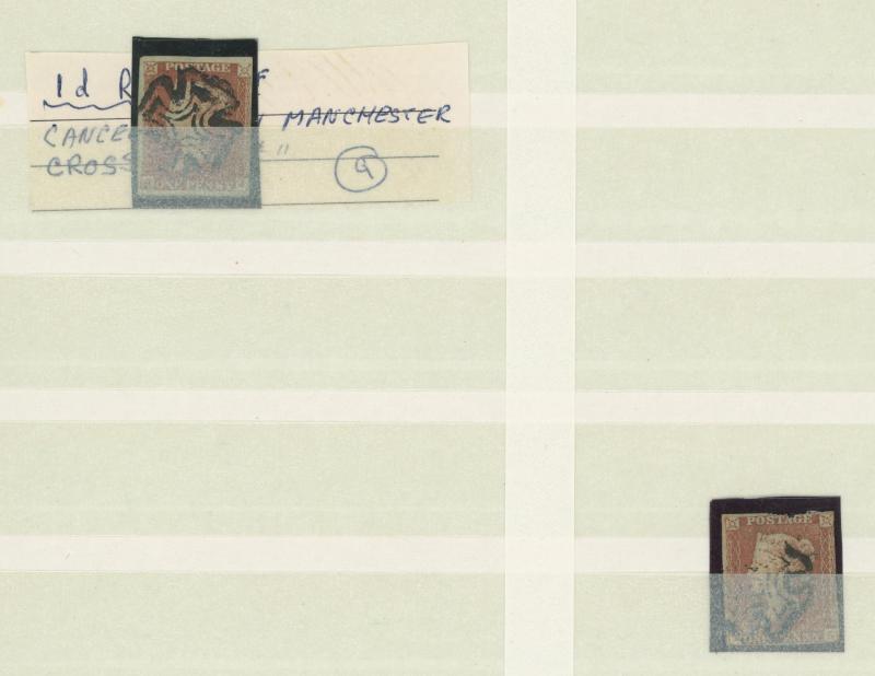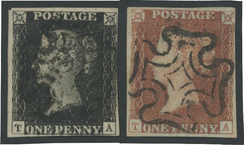 'ONE PENNY' SG Specialised AS67b, light Maltese Cross cancel in black, plus similar matched-letter 1d red-brown Blued Paper Printed from Black Plates SG 7 with the same Original Re-Entry GB Specialised AS68b, very fine Maltese Cross cancel in black,