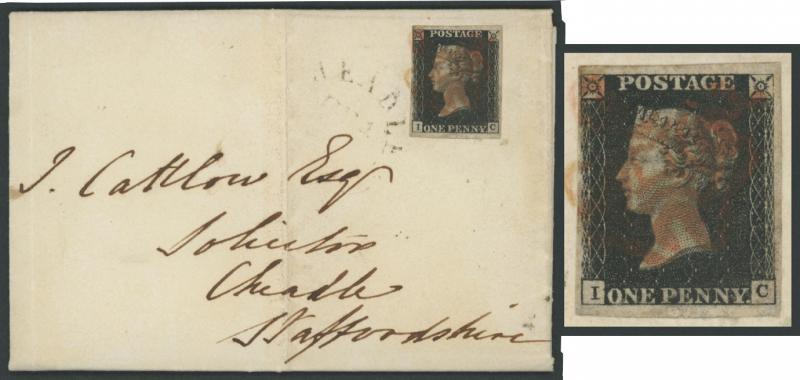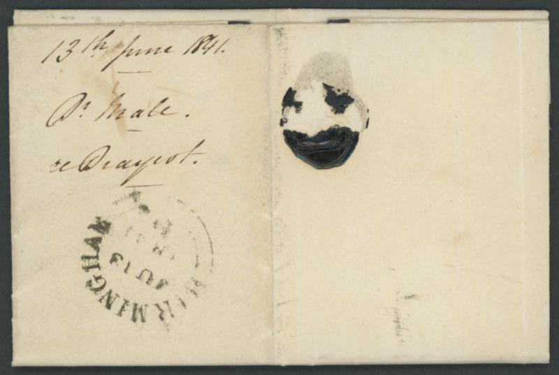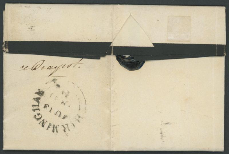 entire mourning letter to Cheadle, Staffordshire with fine complete 'BIRMINGHAM/JU13/1841' despatch backstamp and small-part 'CHEADLE' arrival cds on the face, light vertical file fold clear of the adhesive & markings, the stamp very fine, SG