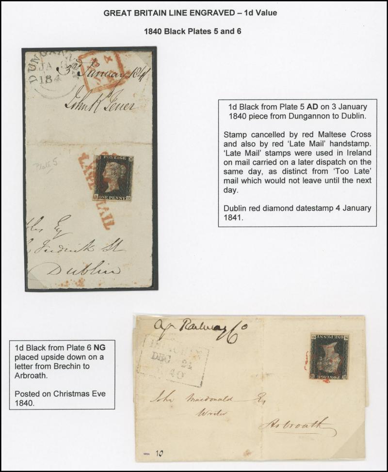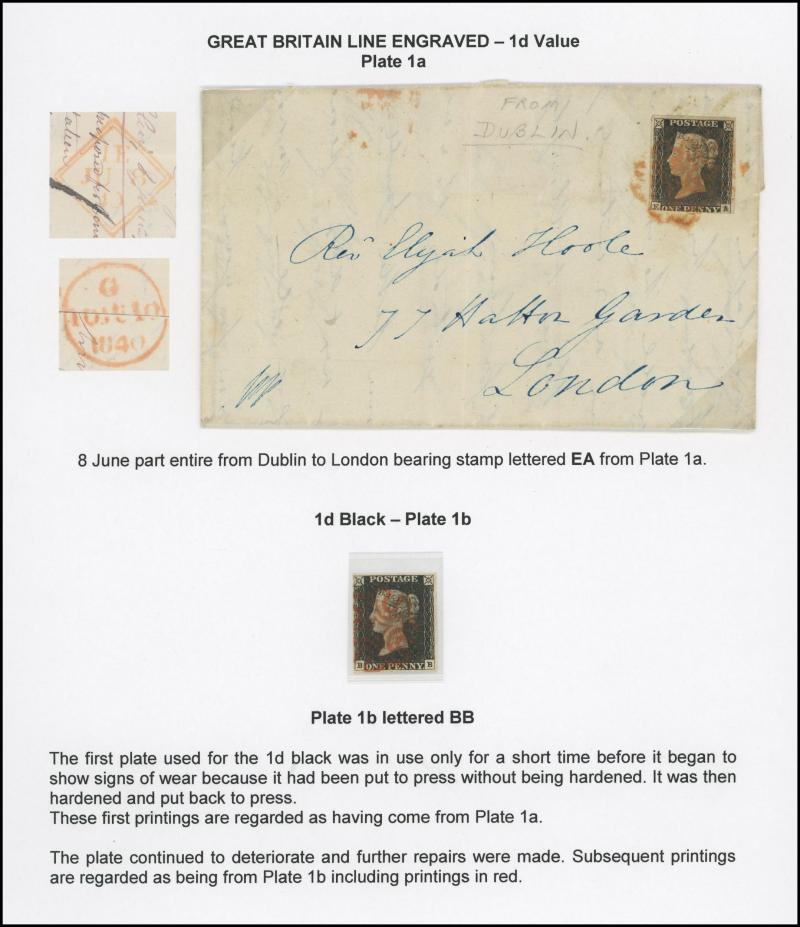 1840 QV Line-Engraved Penny Black 1d black & 1d grey-black SG 2 & 3 group comprising Plate 1a (three margins) on entire from Dublin