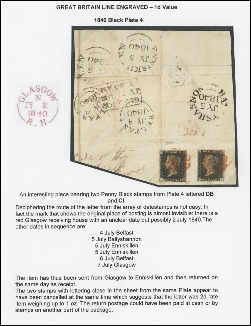 to London; Plate 1b stamp; Plate 2 stamp [RH] plus matching 1d red-brown (Maltese Cross cancel in black) and on entire (three margins; file fold) from Aberdeen to Dingwall; Plate 4 two examples (one with file fold) tied to large piece from Glasgow to