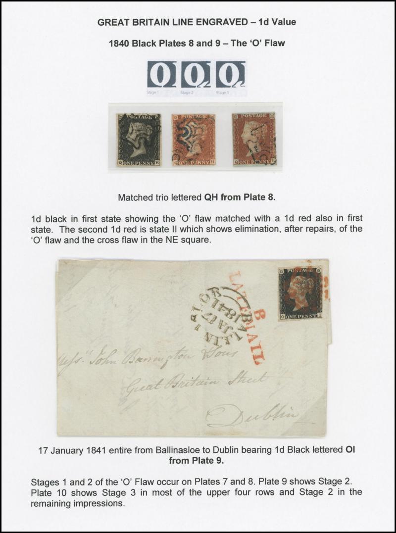 red-brown both with 'O' Flaw and another 1d red-brown with 'O' Flaw Obliterated (the latter two with Maltese Cross cancels in black) plus single (3 margins) on entire from Ballinasloe to Dublin with ' B /LATE MAIL' handstamp; all four margins with