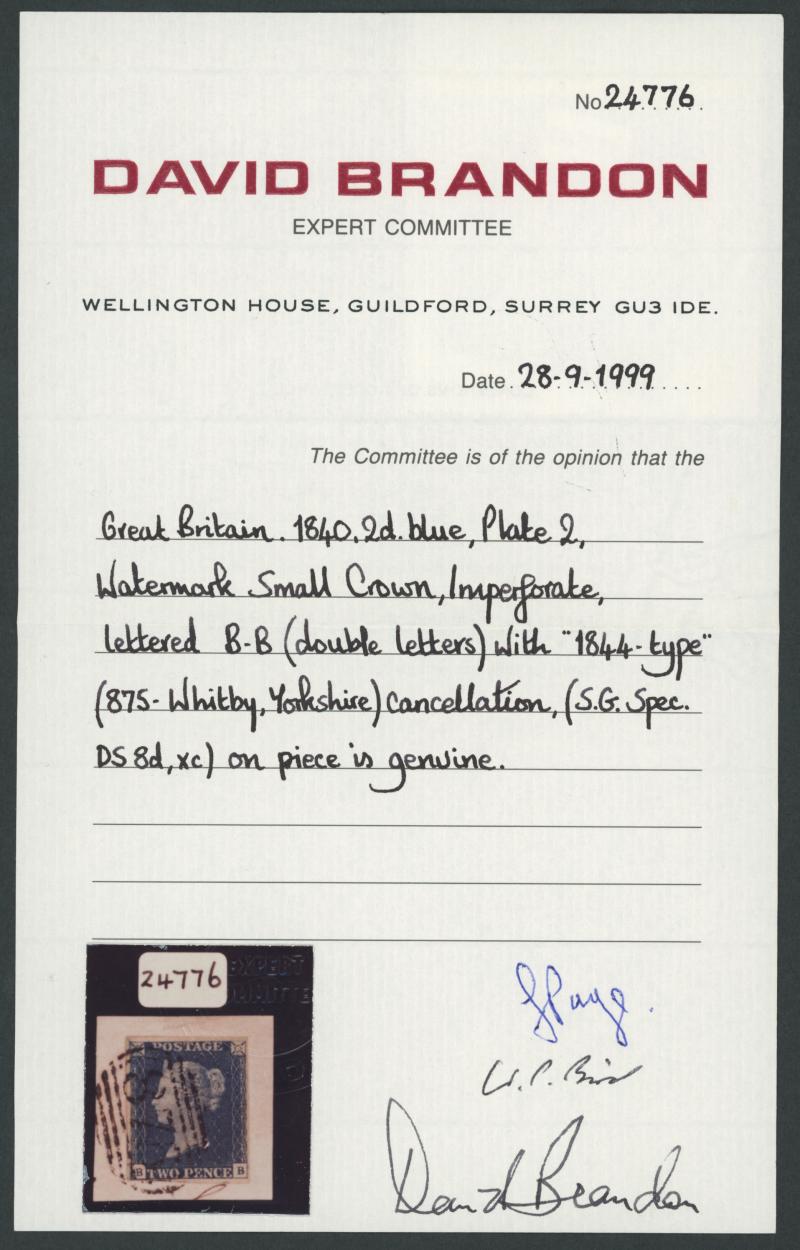 very fine Numeral '875' of Whitby, Yorkshire SG 5i (1844 postmark), Cat £1500+. David Brandon Certificate (1999). (Image1) (Image2)