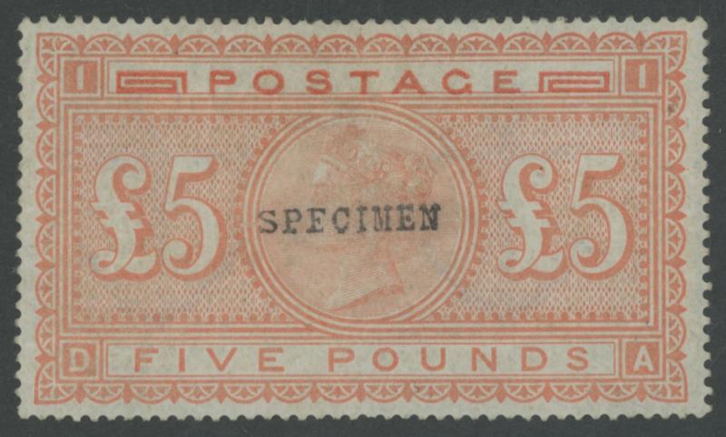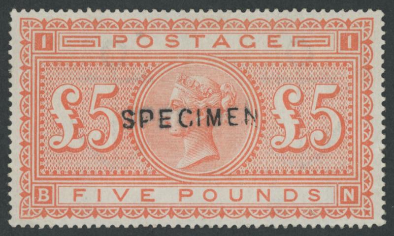 'SPECIMEN' handstamp Type 11 SG Specialised J128t, exceptional centring, minor gum disturbance that in no way detracts from the superb facial appearance, Cat £4500+. The 2026 Gibbons Part One does not list Specimen stamps for the £5 orange on White
