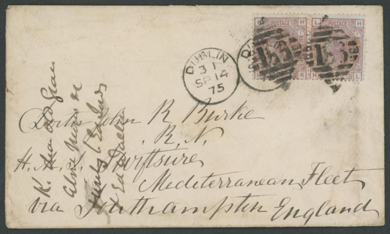 crease & a couple of tiny imperfections, Dublin duplex just impinges on the 'F', Cat £2500; plus singles [KH/HK] & [LH/HL] on 1875 envelope to the surgeon aboard "HMS 'Swiftsure'/ Mediterranean Fleet/...", minor blemishes & repaired flap-tear, Cat