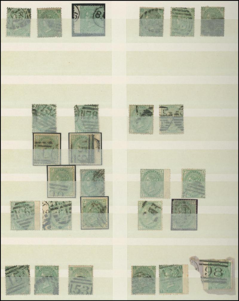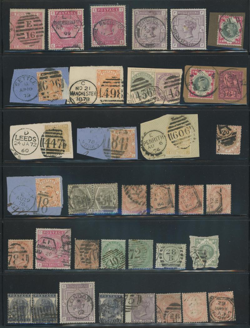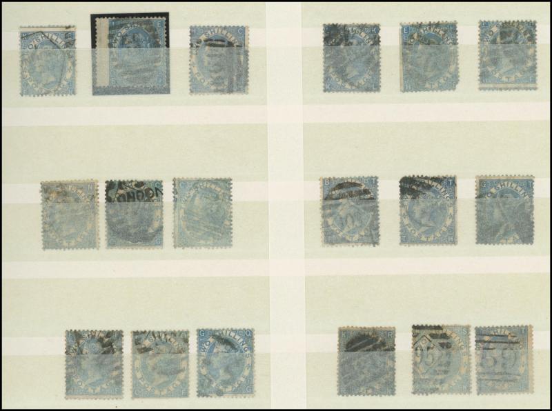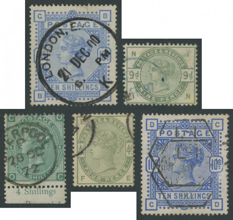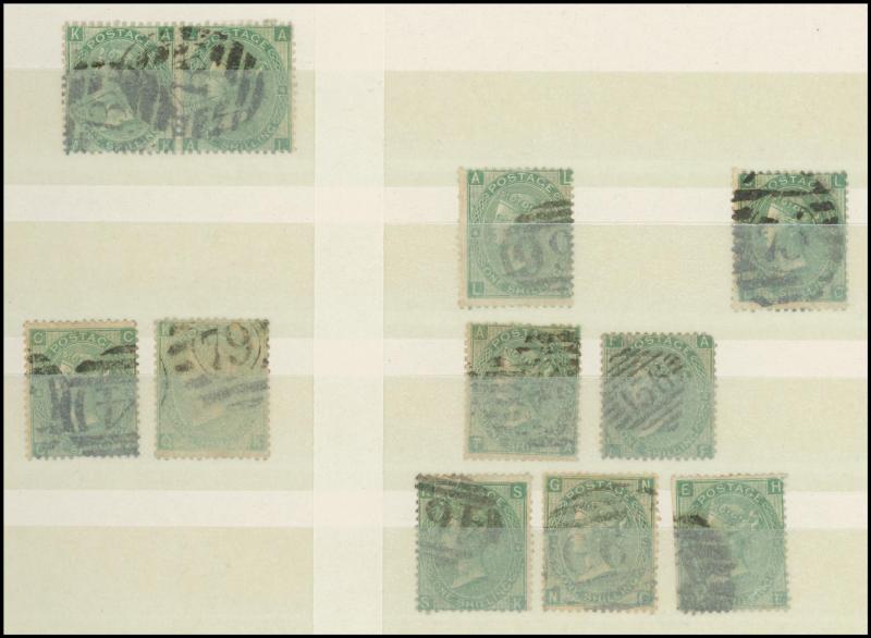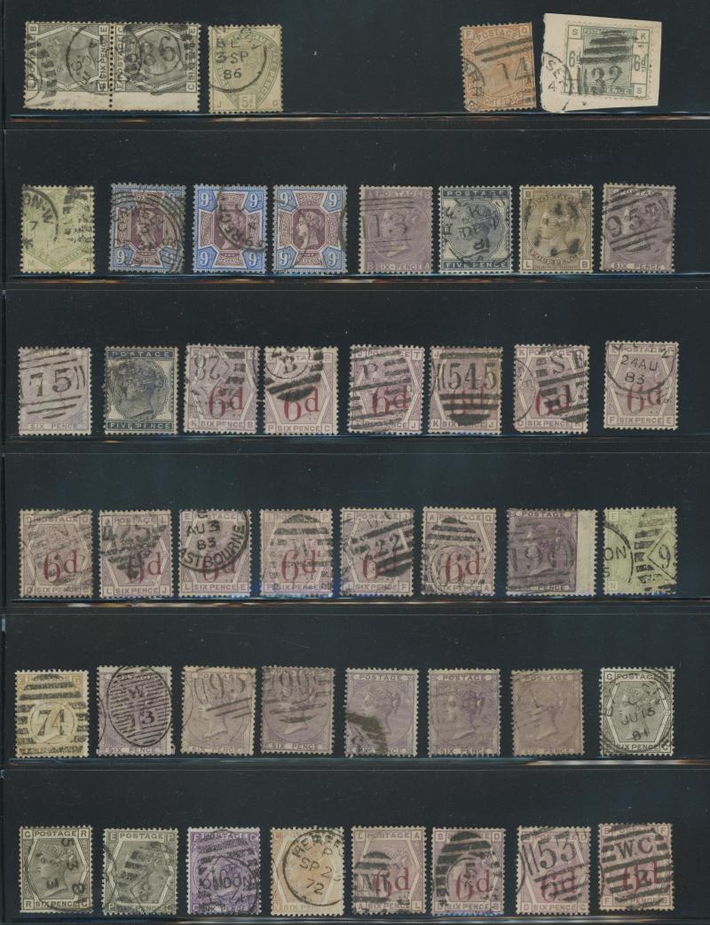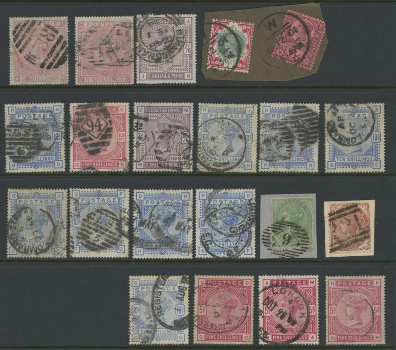 virtually complete reconstruction of 237/240 positions & 5d indigo x6 including a pair, 1883-84 10/- x11 & £1 brown-lilac (spacefiller), Lilacs & Greens set, Jubilee set to both 1/- with strong colours, etc, postmark interest, condition vary mixed