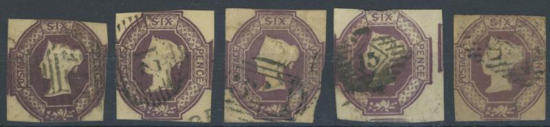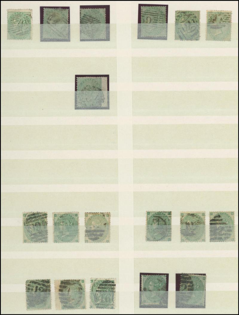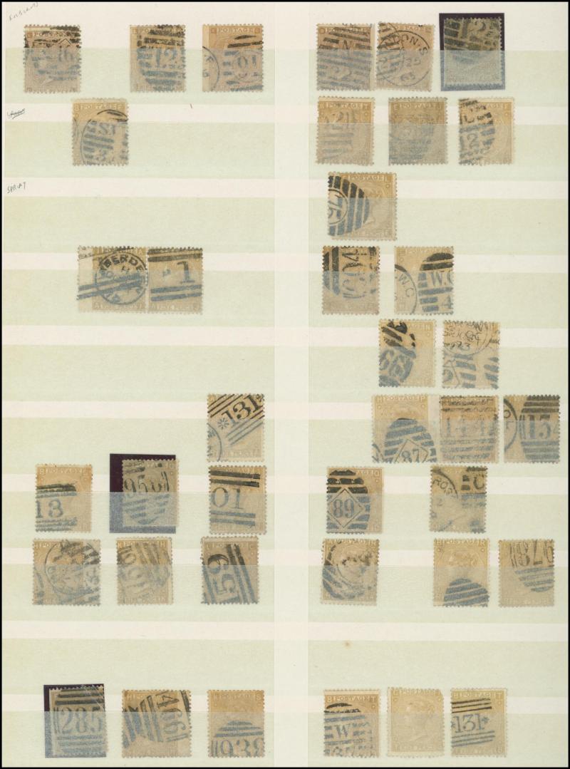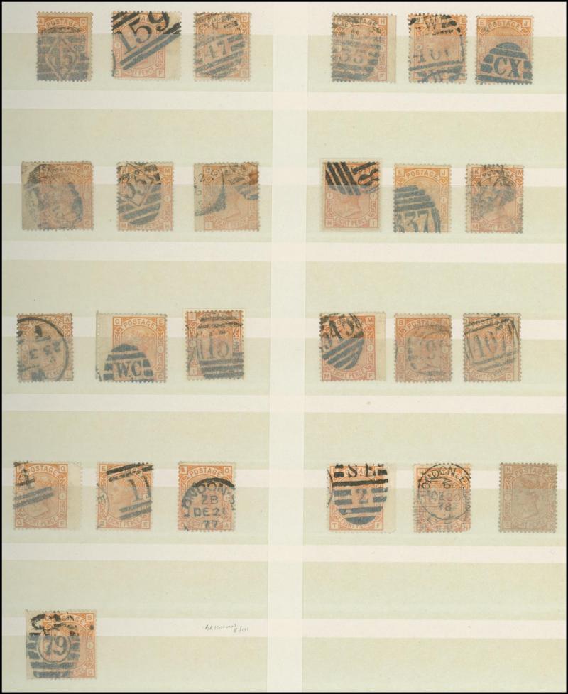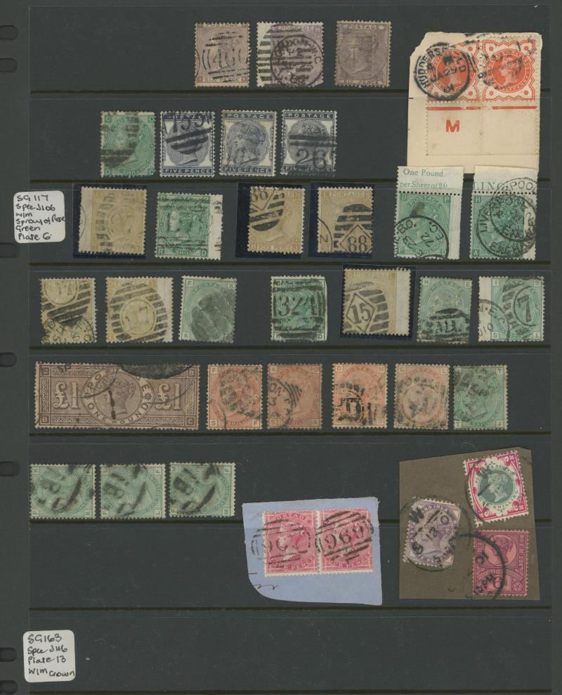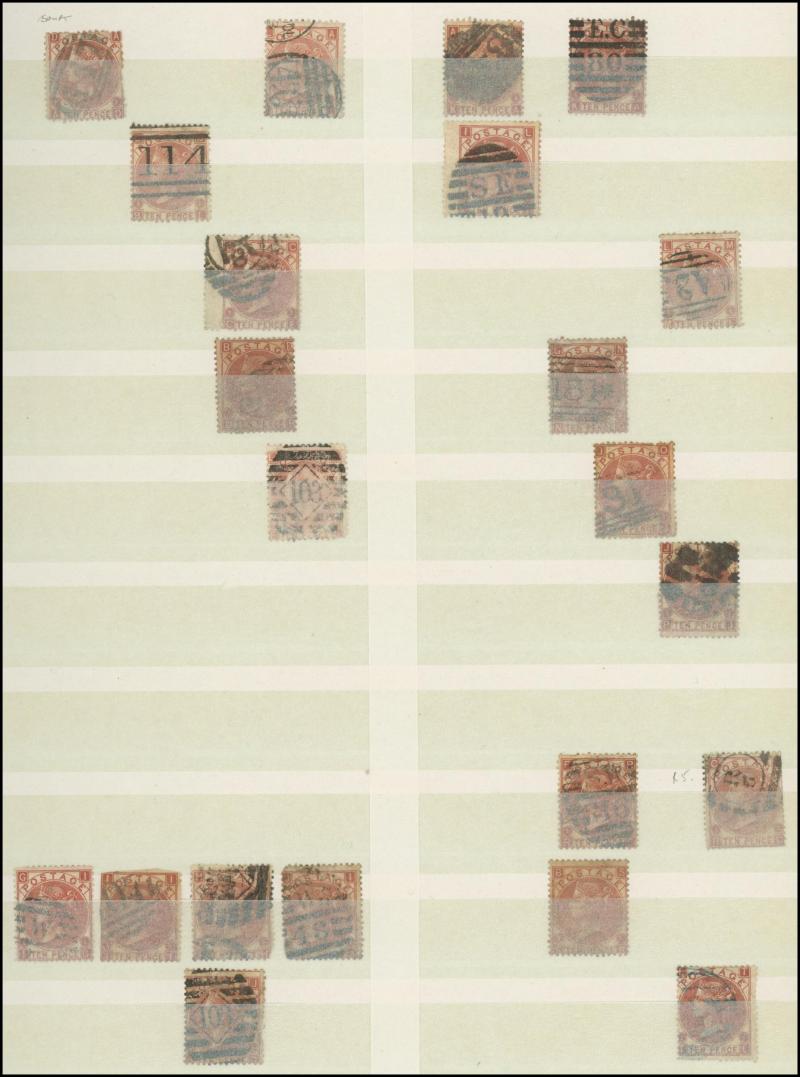 virtually complete reconstruction of 237/240 positions & 5d indigo x6 including a pair, 1883-84 10/- x11 & £1 brown-lilac (spacefiller), Lilacs & Greens set, Jubilee set to both 1/- with strong colours, etc, postmark interest, condition vary mixed
