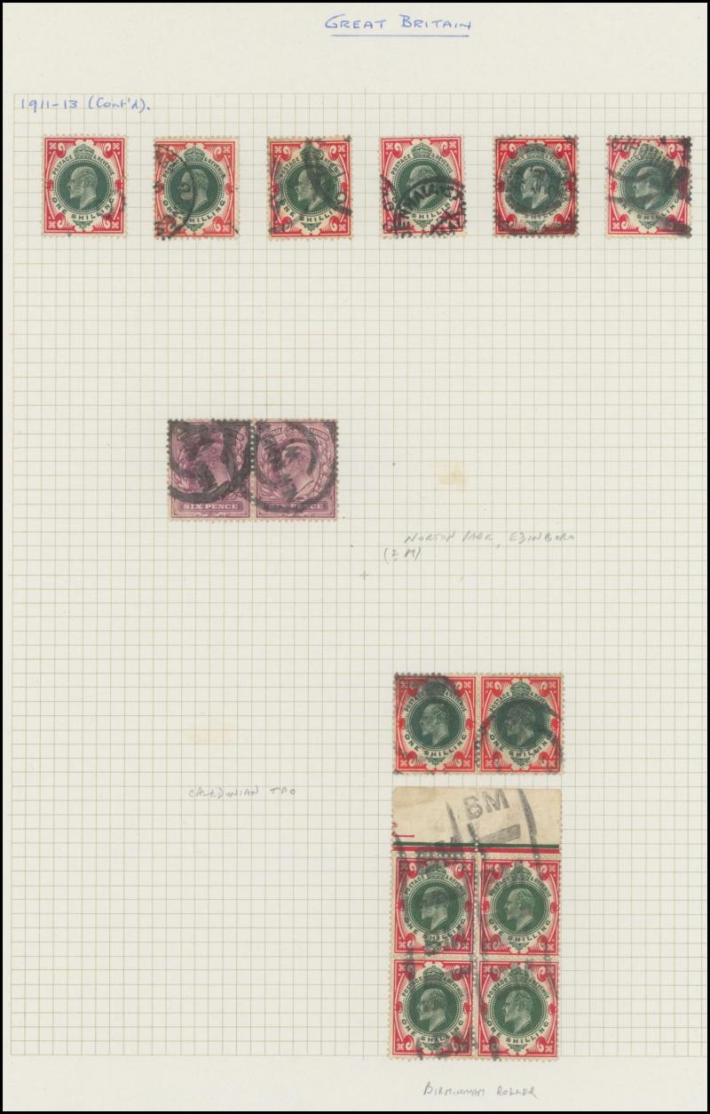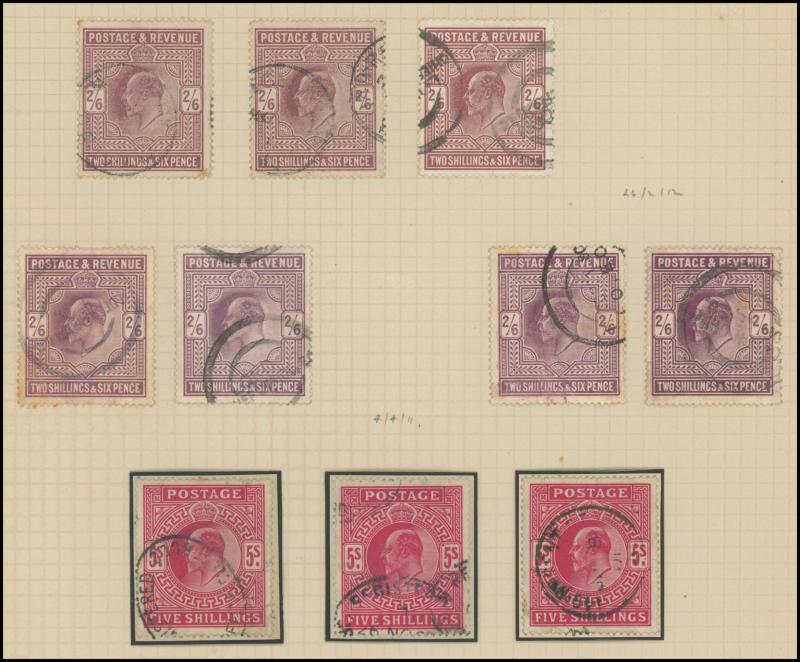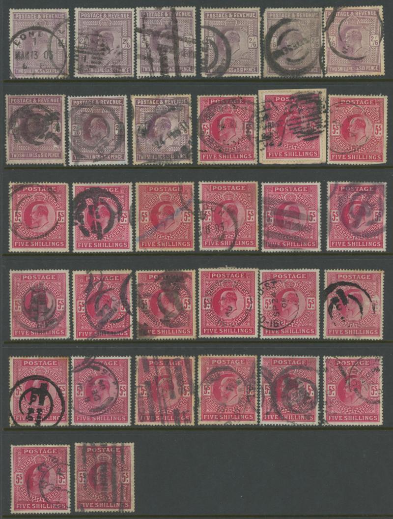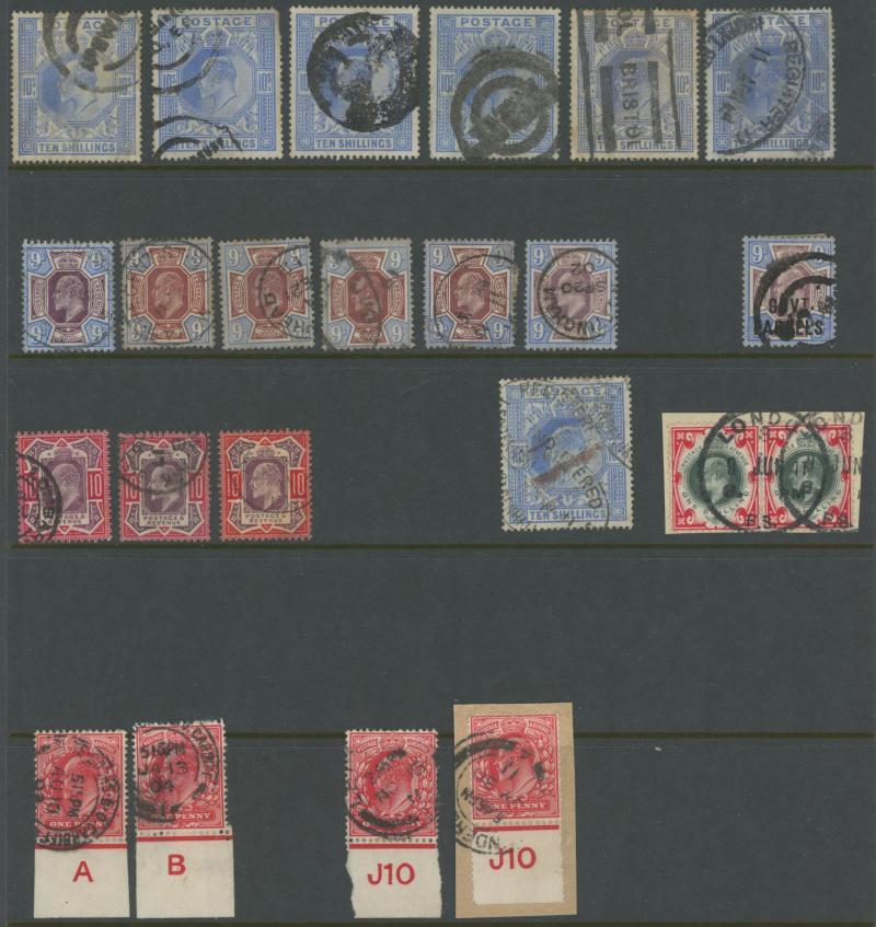 1/- blocks of 4 x2, the High Denominations mostly heavily cancelled or with minor faults comprising 2/6d x40+, 5/- x26, 10/- x7 & £1 (blunt corner perf), also postally used Control Number singles ½d x7 & 1d x22, some postmark interest, significant