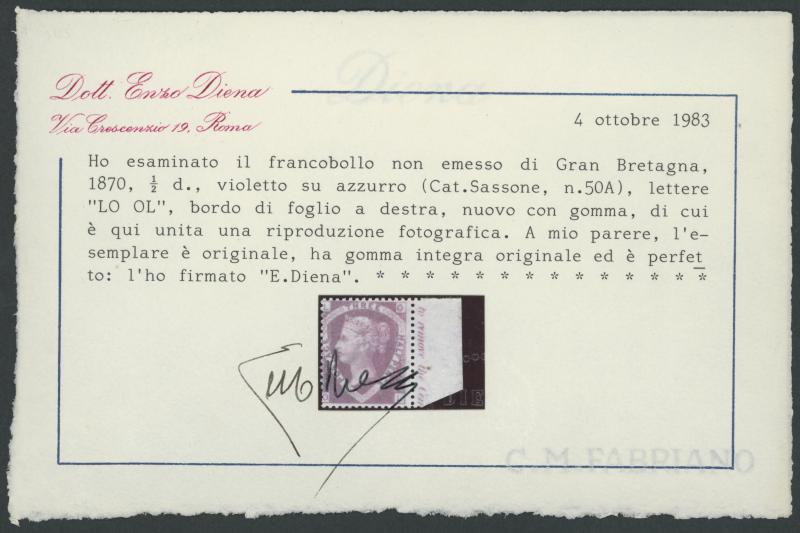 in ultimate state of preservation) and Enzo Diena ("...ha gomma integra originale ad e perfetto" = is with original gum and perfect") Certificates. Acquired at an Italian auction for €2620. An unmounted non-marginal example is currently advertised by