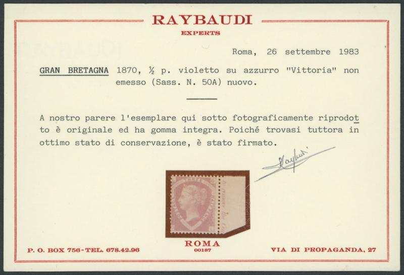 with partial inscription '...to remove the Cem[ent...]', full unmounted original gum lightly signed by Raybaudi and Enzo Diena, Cat £4500 for 'unused'. Superb example of this rare unissued stamp. 1983 Raybaudi ("...in ottimo stato di conversazione" =