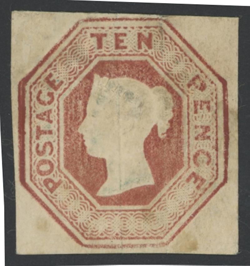 small-part gum, Cat £4500. Unissued: prepared in 1860 for an anticipated rate increase that was not approved. 10,000 sheets were printed, of which 8,962 were destroyed after the issue did not proceed, and a further 1,000 sheets were overprinted