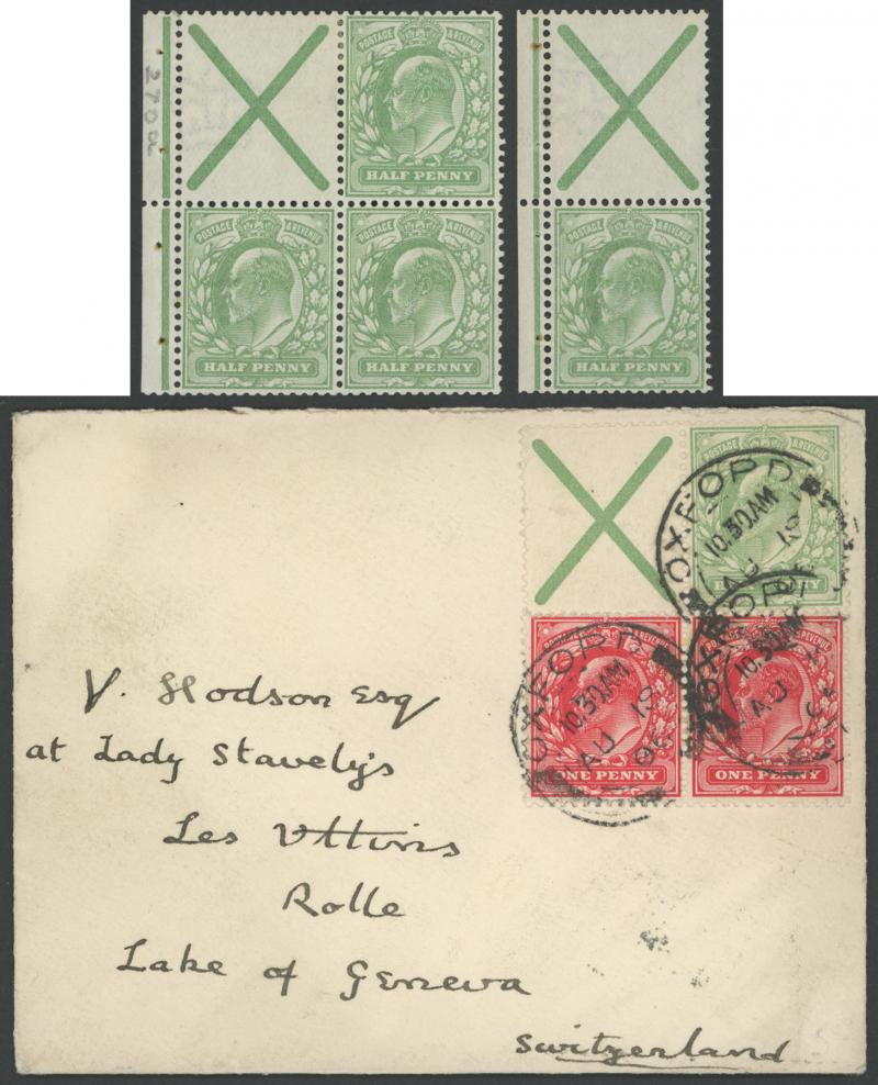 18/06' cds cancel alongside KGV 1d red pair on Merton College envelope to Switzerland, Cat £550+ for two mounted & one used pair (unpriced on cover).