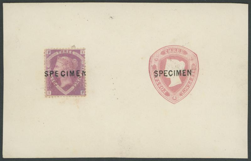 [IF] affixed to a large piece alongside an impression of the Embossed 1½d pink Postal Stationery value indicium also overprinted 'SPECIMEN' Type 2, a complete offset of the embossed impression on the reverse, a couple of very minor blemishes, the
