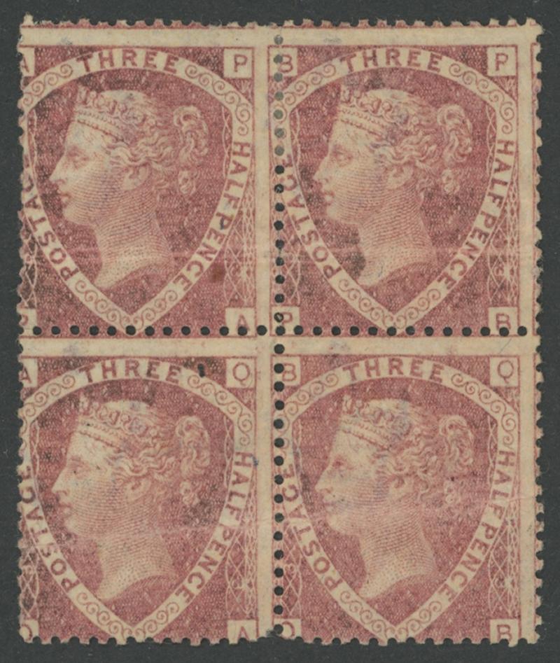 1870-79 QV Line-Engraved New Values Shield 1½d rose-red SG 51 Plate 3 block of 4 [PA-PB/QA-QB], characteristic wayward centring