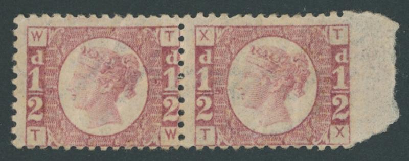 1870-79 QV Line-Engraved New Values Bantam ½d rose-red SG 48 Plate 5 horizontal marginal pair [TW-TX] from the right of the sheet