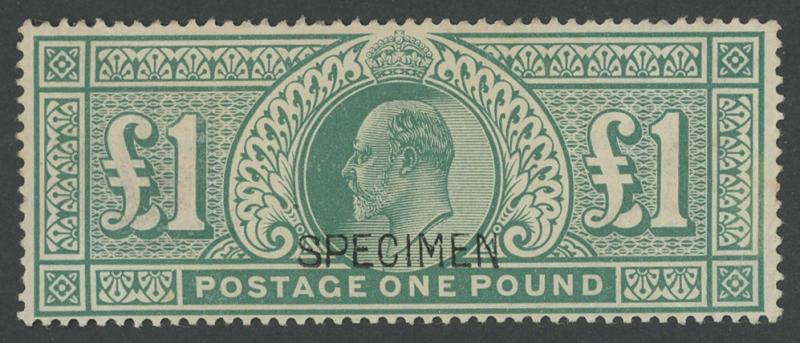 1902-10 KEVII Definitives De La Rue Printings £1 blue-green with sans-serif 'SPECIMEN' Handstamp SG 266s, well-centred, large-part