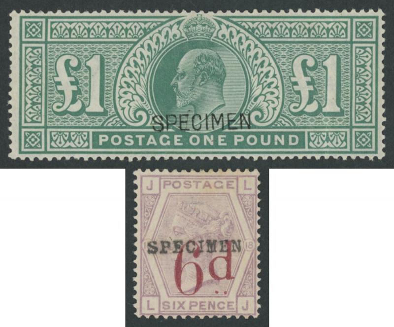 minor gum bends, also QV '6d' on 6d with seriffed 'SPECIMEN' Handstamp Type 9, no gum, Cat £1700. (2) (Image1) (Image2)