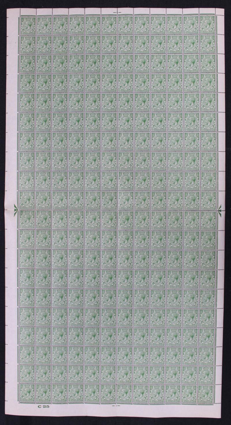 1924-26 KGVI Block Cypher Wmk ½d green SG 418 complete sheet of 240 (12x20) with Control 'C25' at lower-left, central fold and