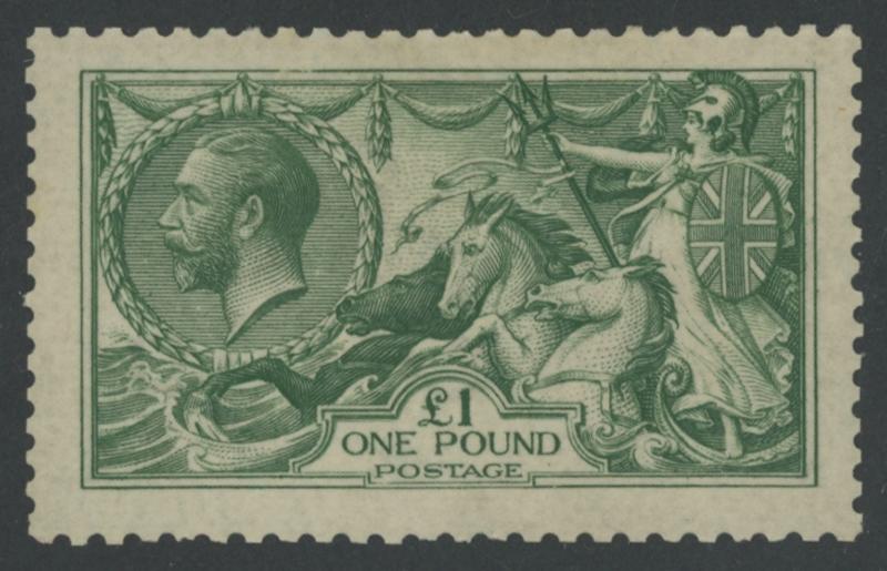 1913-19 Seahorses Waterlow Printings £1 dull blue-green SG 404, exceptionally well-centred, a couple of slightly uneven perfs,