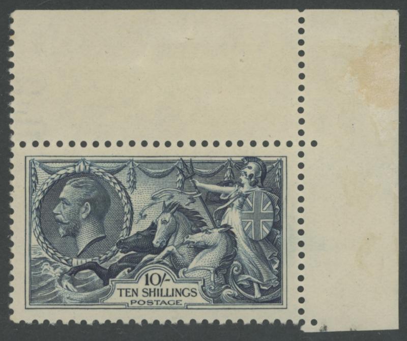 1913 KGV Seahorses Waterlow Printings 10/- indigo-blue SG 402 marginal single from the upper-right corner of the sheet, fresh