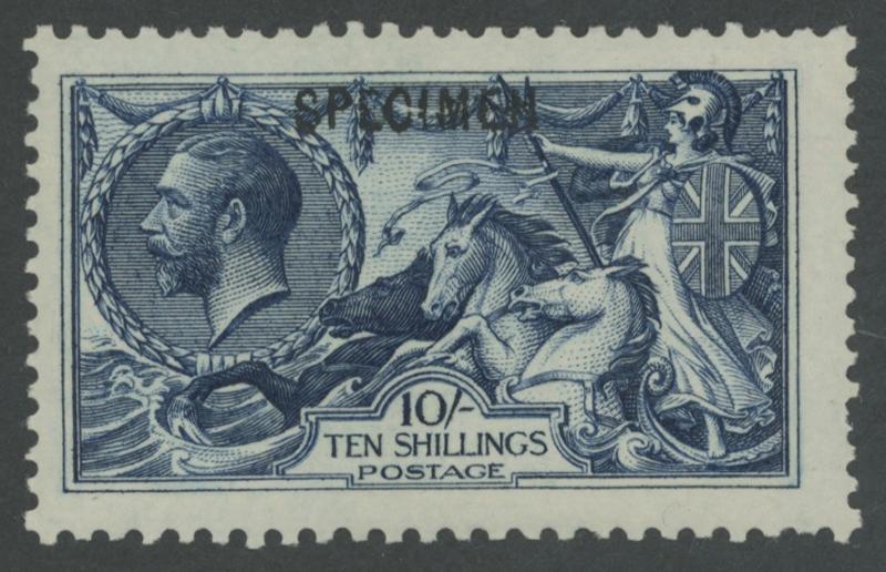 1913 KGV Seahorses Waterlow Printings 10/- indigo-blue with sans-serif 'SPECIMEN' overprint Type 26 SG 402s, fresh colour, a couple