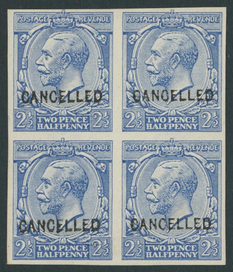 1912-24 KGV Heads Royal Cypher Single (Simple) Watermark 2½d blue imperforate colour trial overprinted 'CANCELLED' SG Specialised