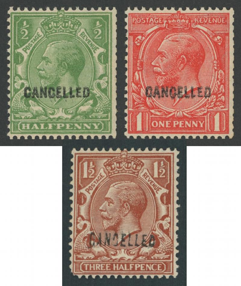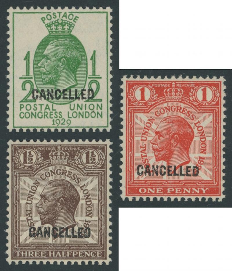1929 Postal Union Congress ½d green, 1d red & 1½d brown 'set' with 'CANCELLED' overprints unpunctured SG Specialised NCom5t, 6t &