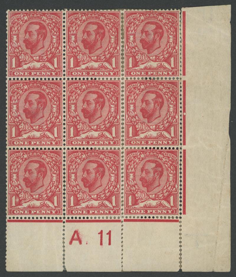 Somerset House Paper SG Specialised N17A marginal block of 9 from the lower-right corner of the sheet with Control Number 'A. 11', extensive perf separation & hinge reinforcement, vertical creasing affecting all units except the central column. Rare:
