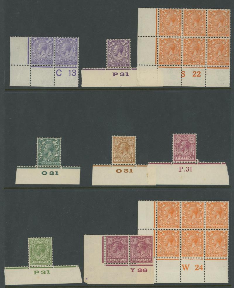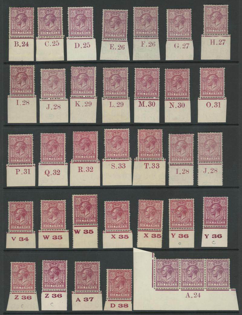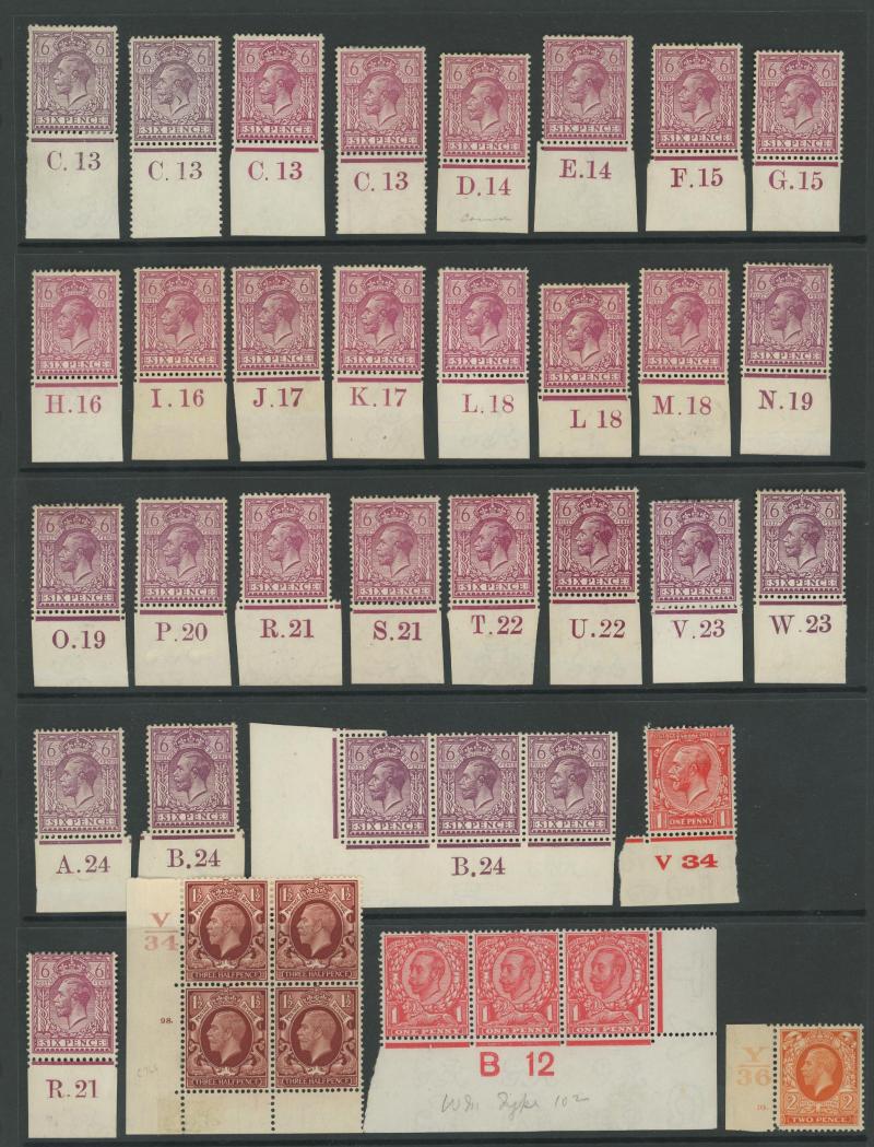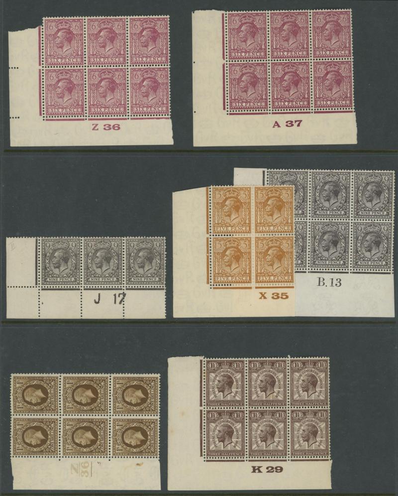 1924 6d purple block of 6 'D 38' and 1913 10d turquoise-blue block of 6 'C. 13', generally fine to very fine with some being unmounted. Opportunity for specialists.