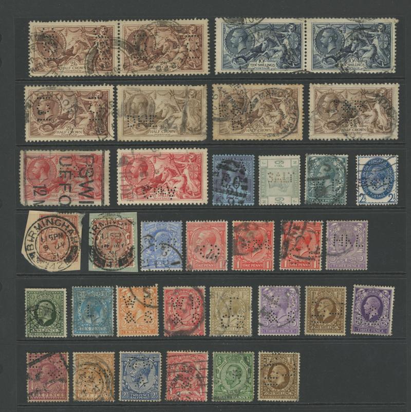 COMMERCIAL PERFINS: Partly sorted and annotated array with strength in KEVII and KGV reigns including unusual patterns such as