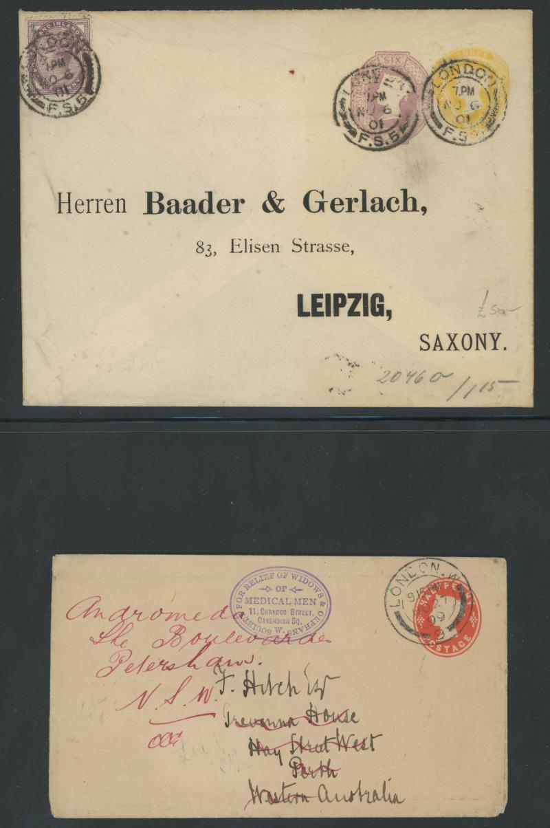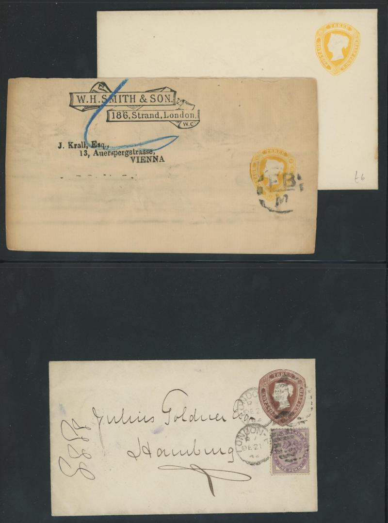 multiple embossings, a good number are commercial including for stamp dealers, destinations include 1891 10d for Alfred Smith & Son to Austria, 1894 2½d+2½d to Cook Islands, 1895 1½d+2d+6d to Singapore, 1896 1½d+3d illustrated for Alfred Smith & Son