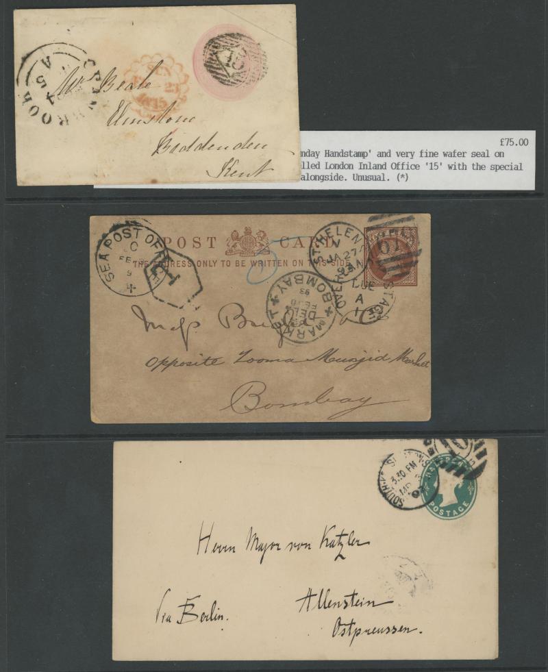 front punctured 'T&/WF', seven Postal Cards with Sloper 'cancels' (arrow punctures, etc), advertising collars x8 different including on 1877 envelope for Philatelic Quarterly (address erased) & undated 1d Wrapper for WH Smith, a few usages of