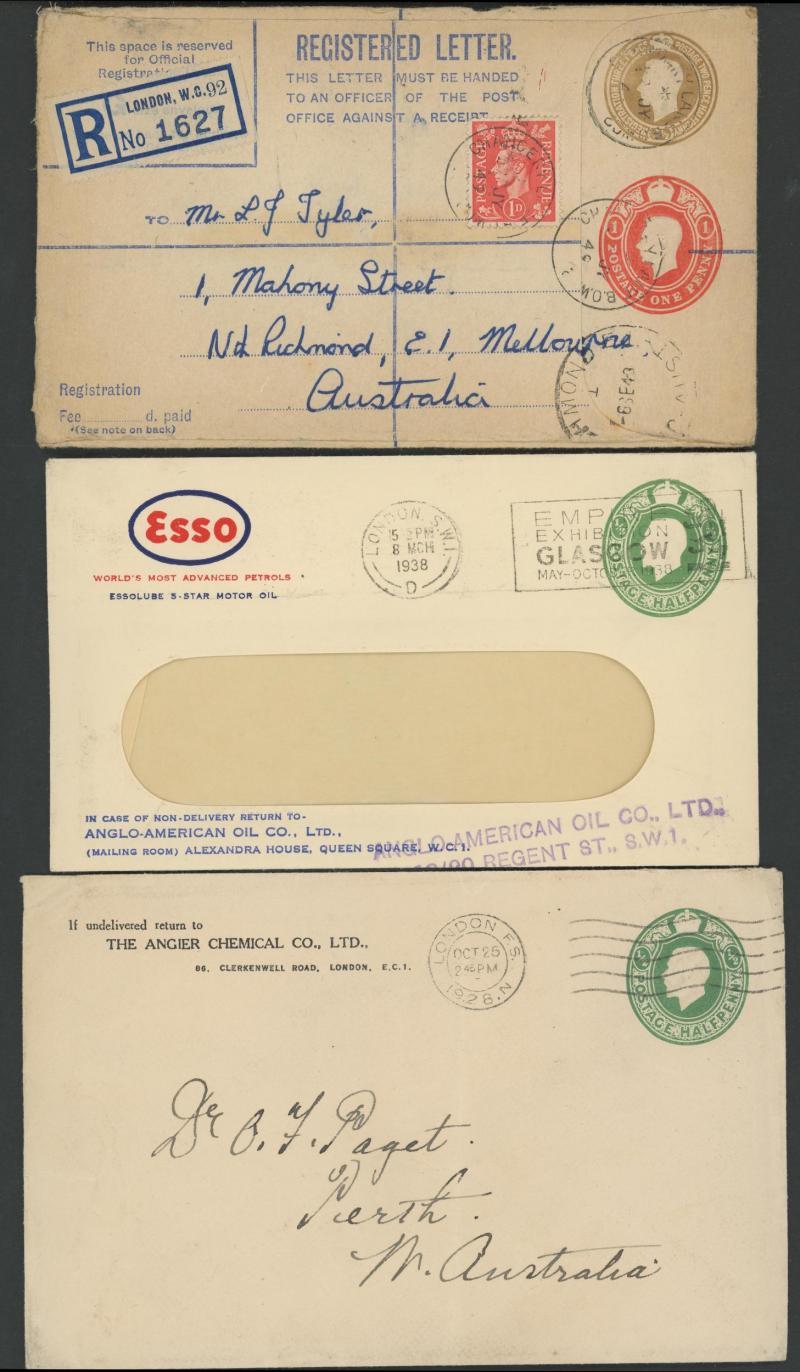 embossings, about half are registered, users include stamp dealers, mining companies & Cadbury Chocolates, mostly to European countries but also to Peru, Turkey, Japan, Argentina, Australia & USA, generally fine to very fine. Another enticing lot.