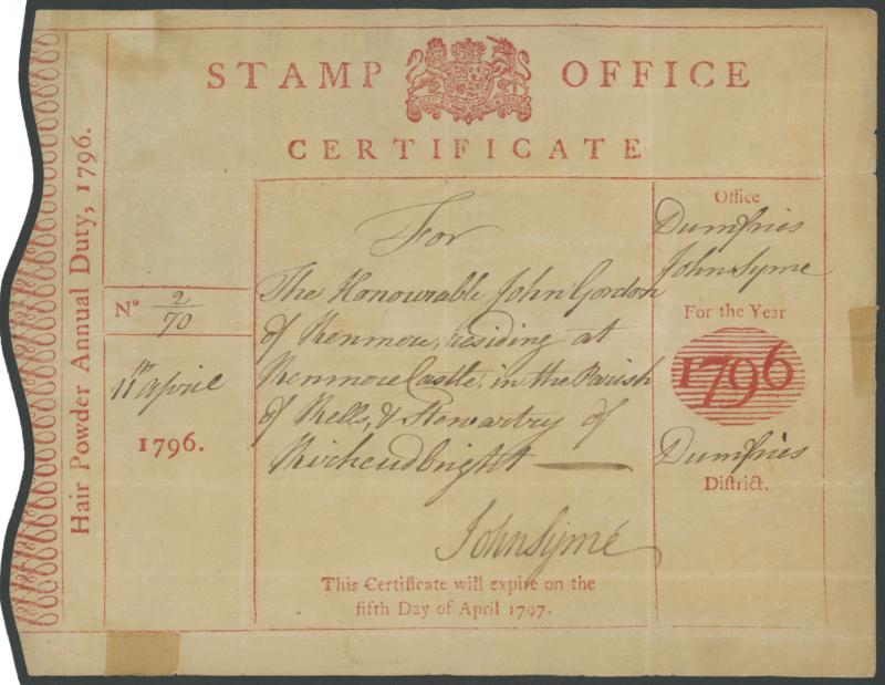 REVENUES: 1796 Scottish 'STAMP [arms] OFFICE/CERTIFICATE' printed in red & inscribed 'Hair Powder Annual Duty, 1796', huge 'HAIR