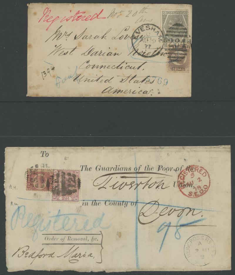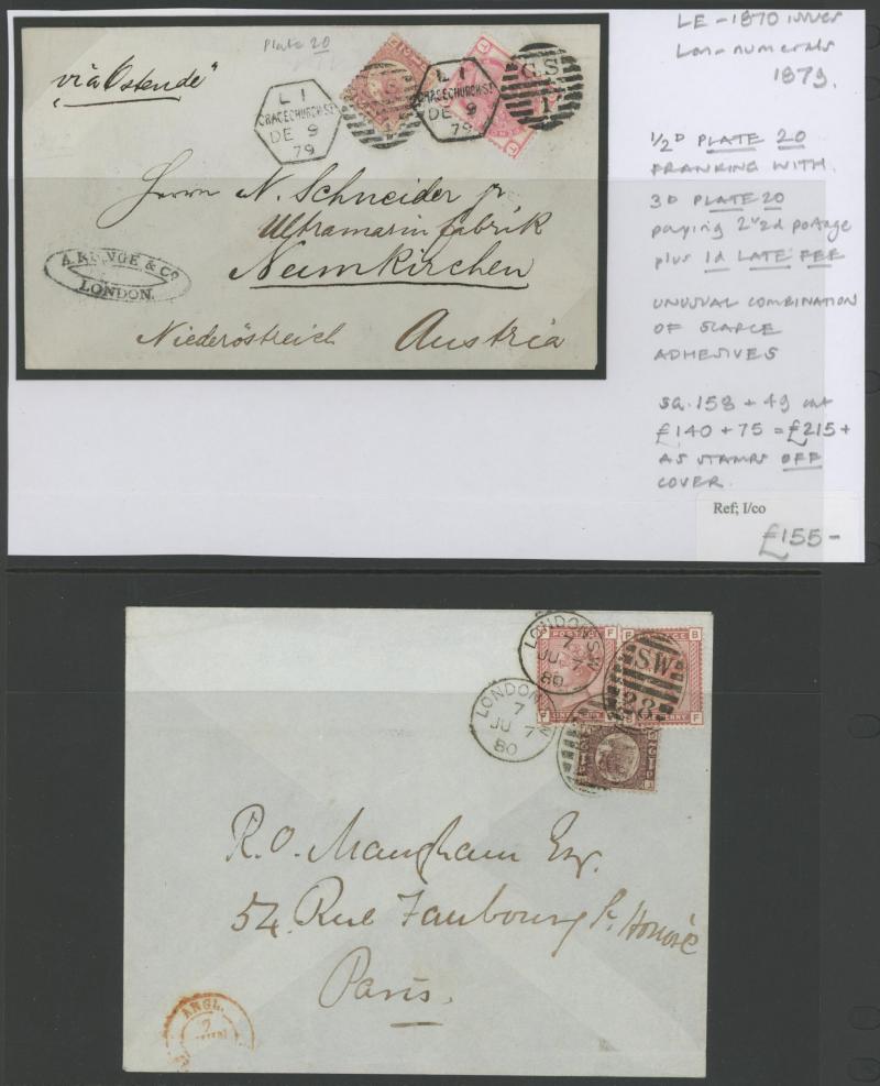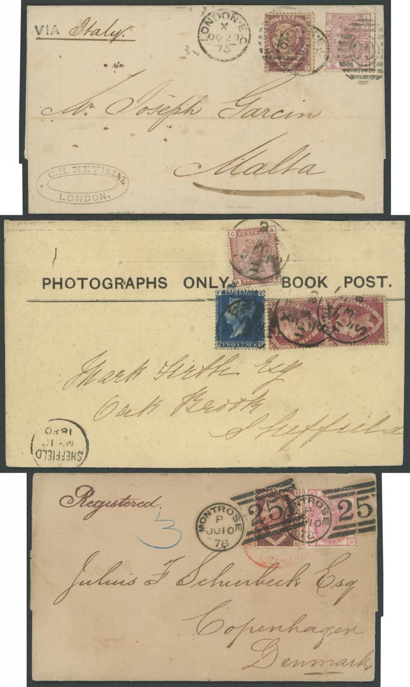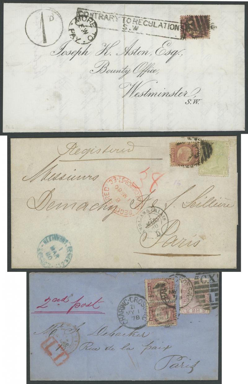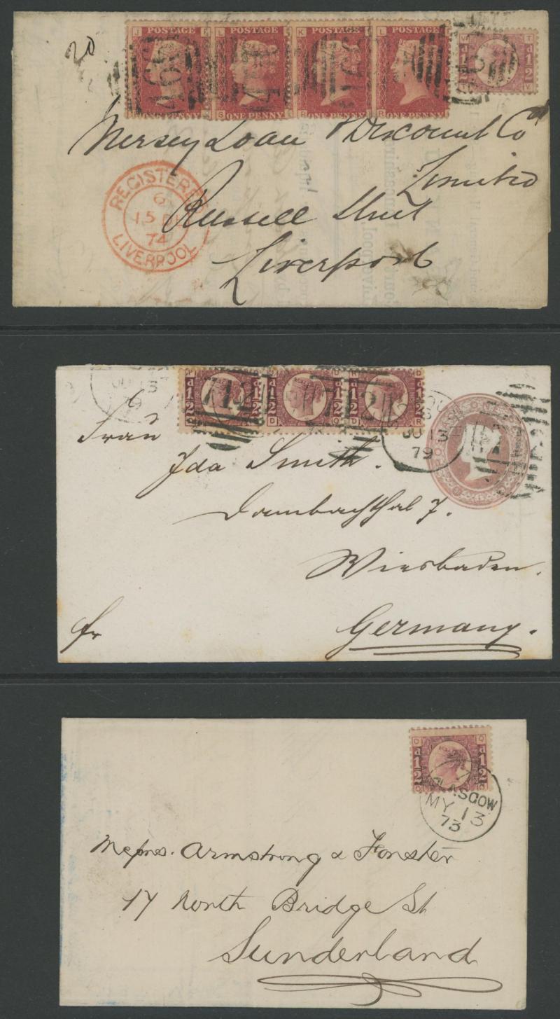'L1' boxed cachet in red, 1878 to Germany with ½d Plate 10 block of 4 plus Line-Engaved Letters 1d, 1878 to USA single with Letters 2d blue, 1878 folded notice registered to France with ½d plus Surface-Printed 2½d rose for 1d printed matter rate plus