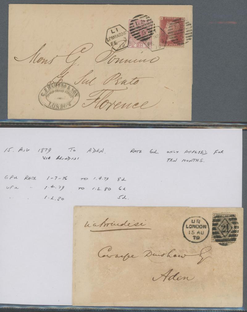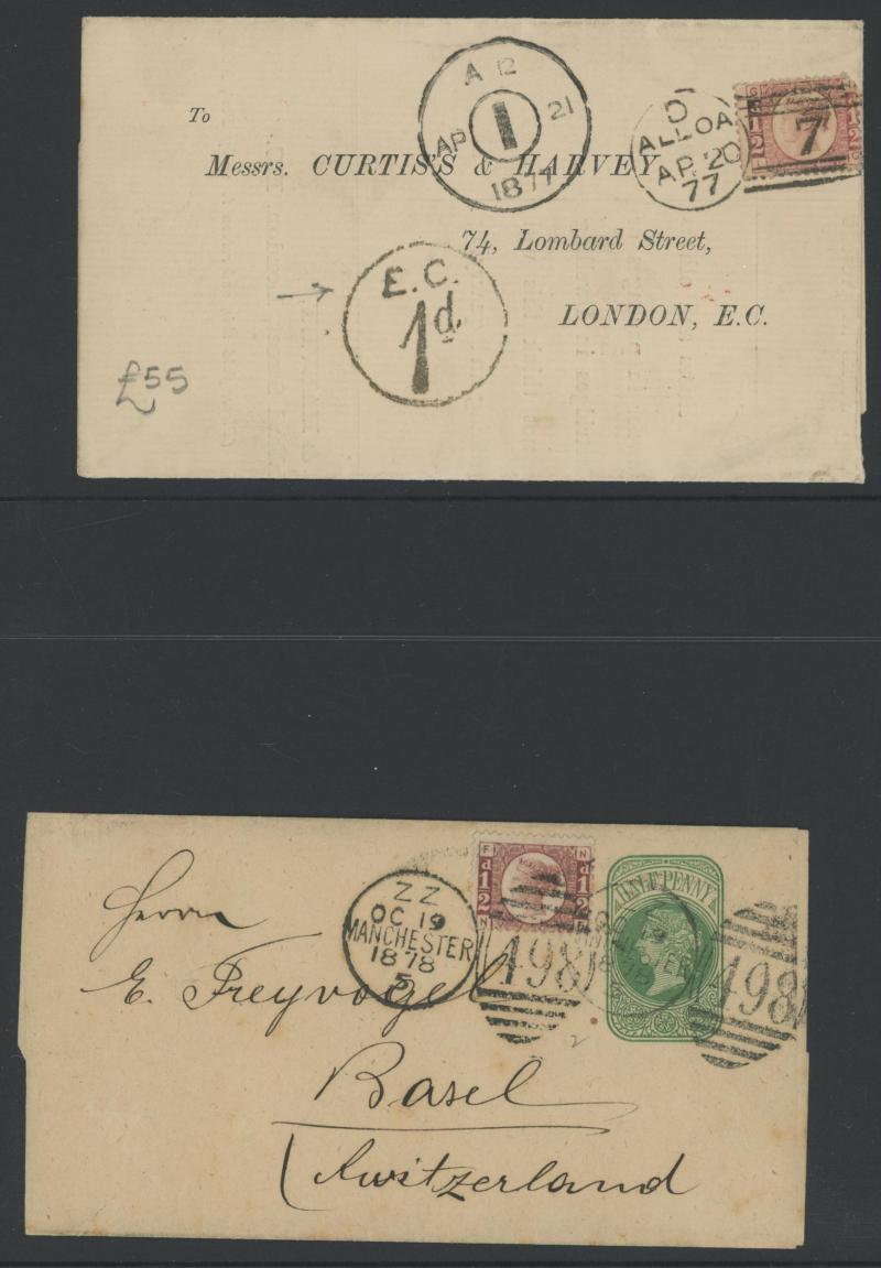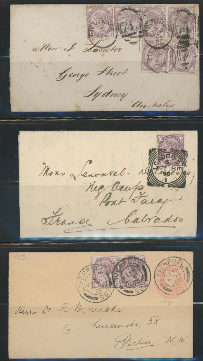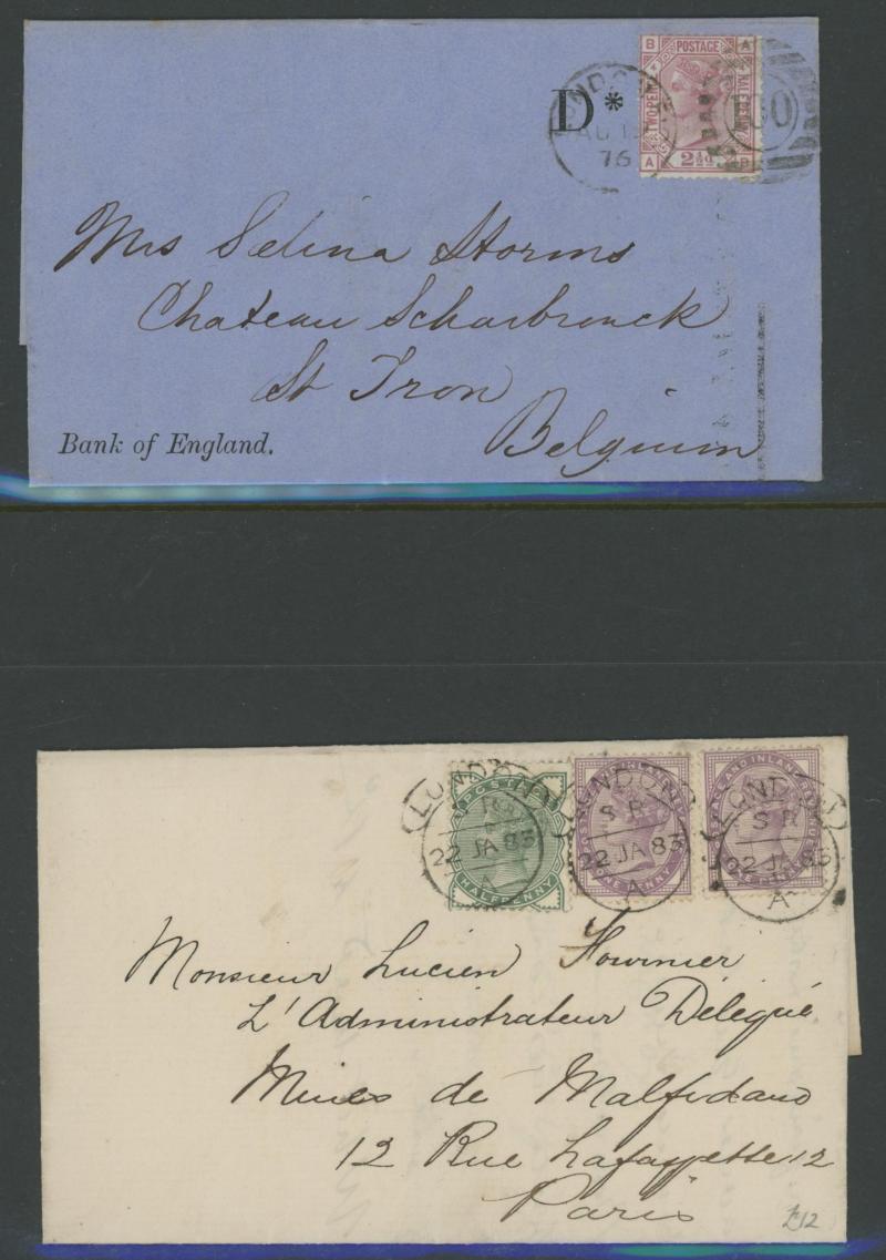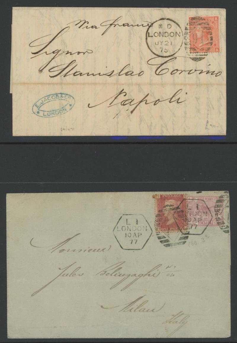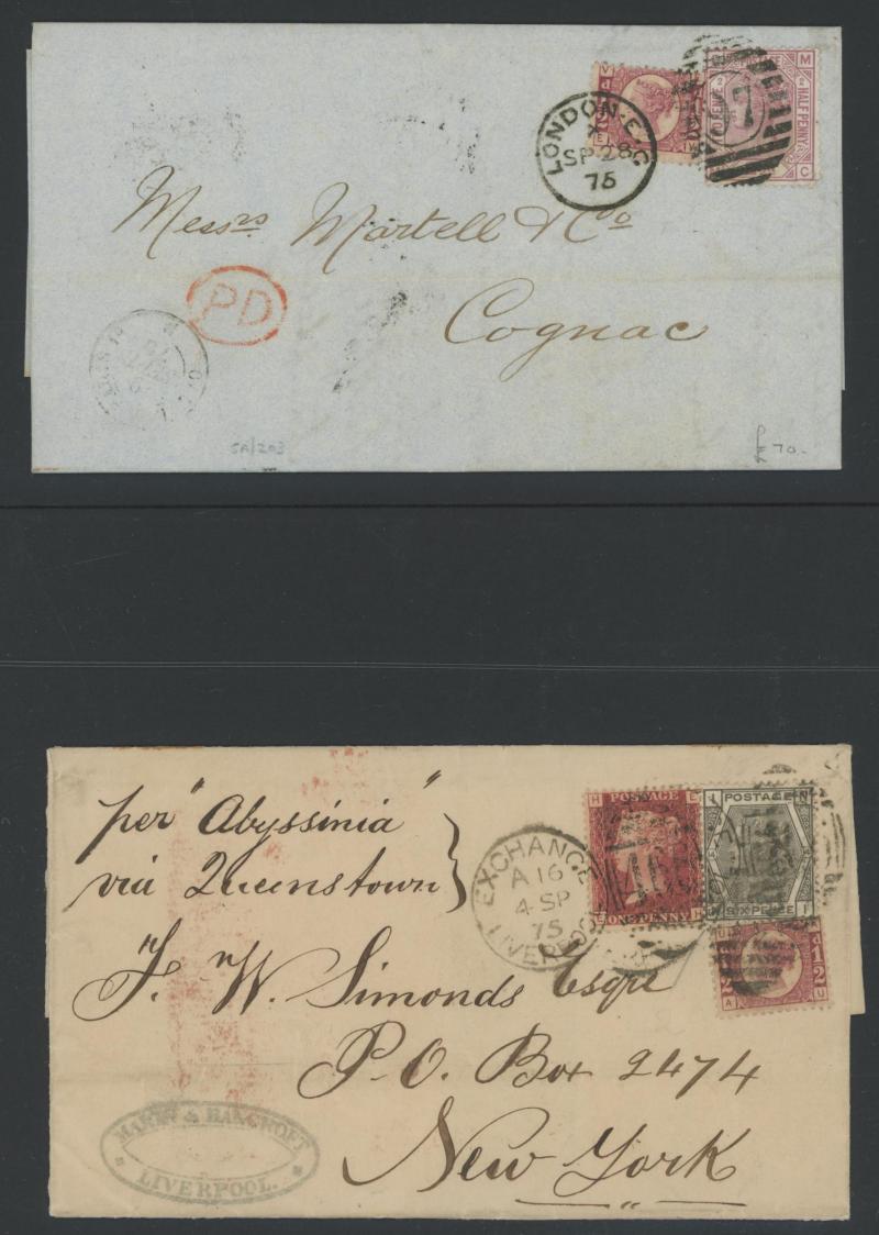 'L1' boxed cachet in red, 1878 to Germany with ½d Plate 10 block of 4 plus Line-Engaved Letters 1d, 1878 to USA single with Letters 2d blue, 1878 folded notice registered to France with ½d plus Surface-Printed 2½d rose for 1d printed matter rate plus