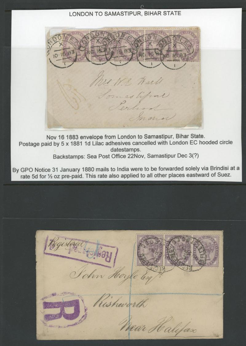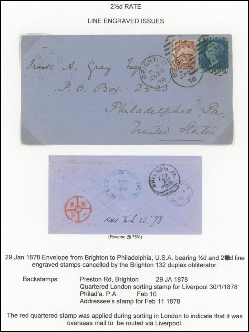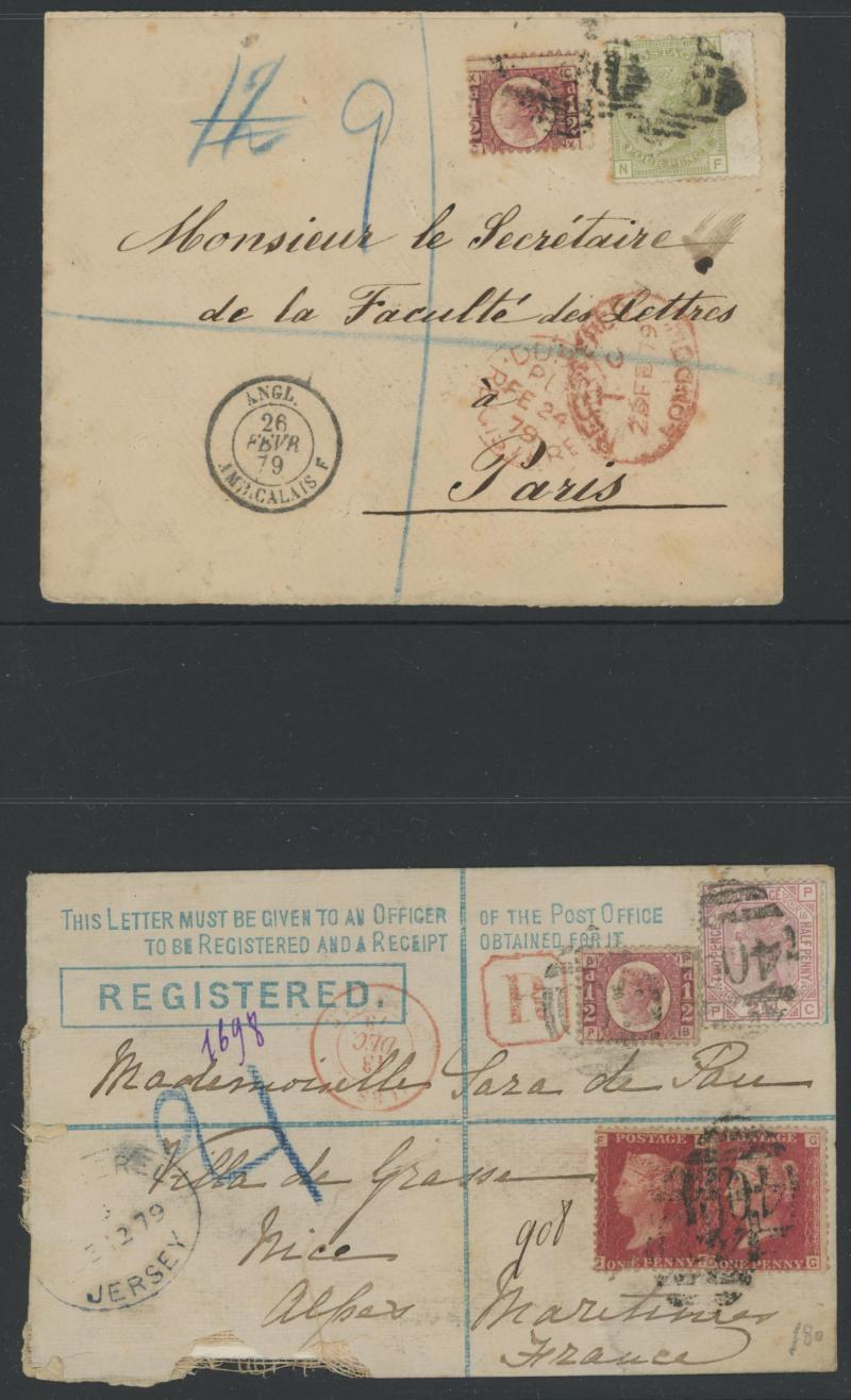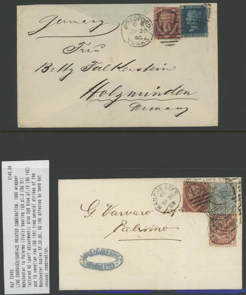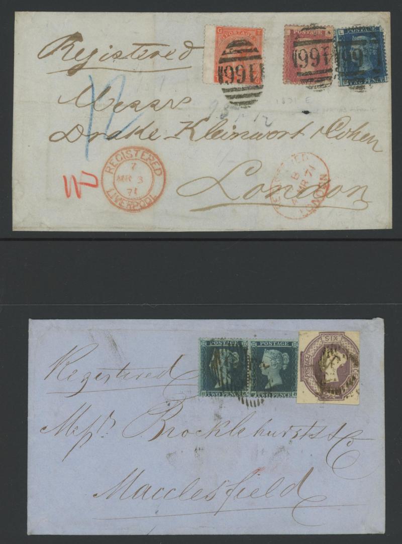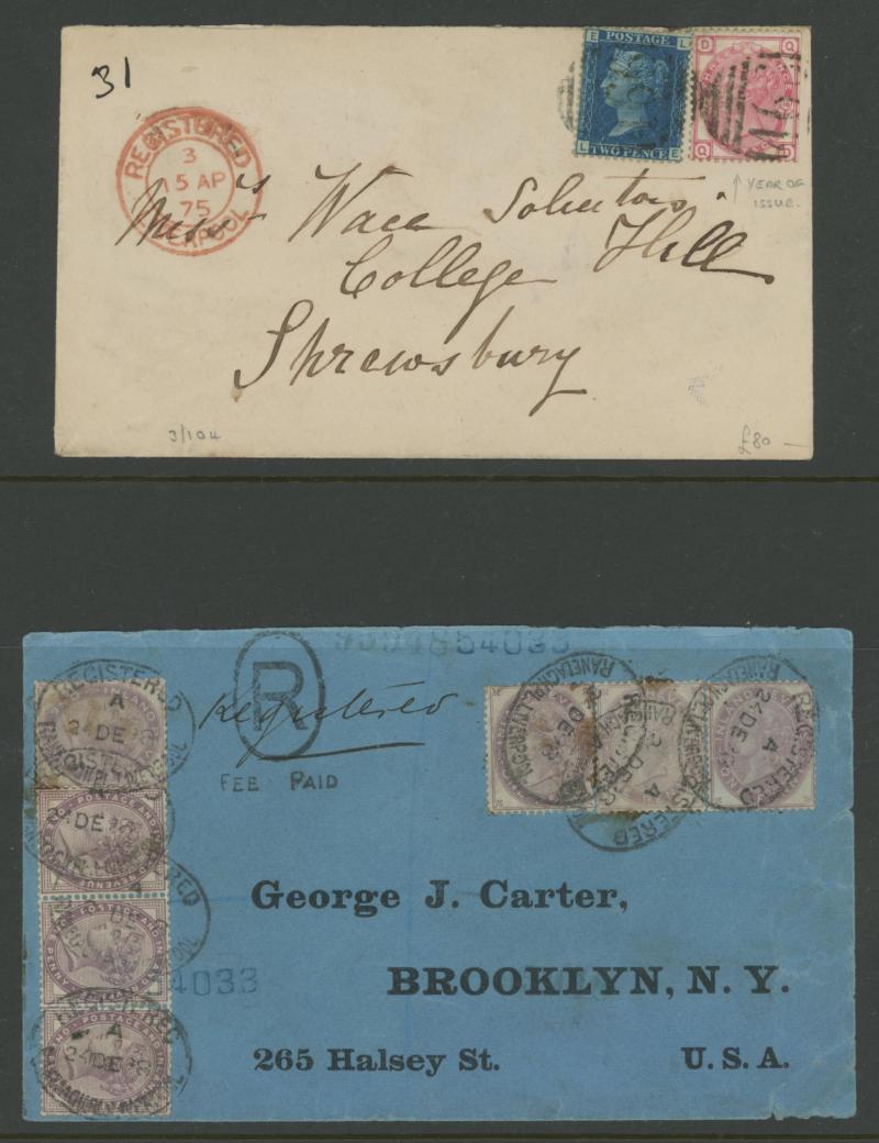 'L1' boxed cachet in red, 1878 to Germany with ½d Plate 10 block of 4 plus Line-Engaved Letters 1d, 1878 to USA single with Letters 2d blue, 1878 folded notice registered to France with ½d plus Surface-Printed 2½d rose for 1d printed matter rate plus