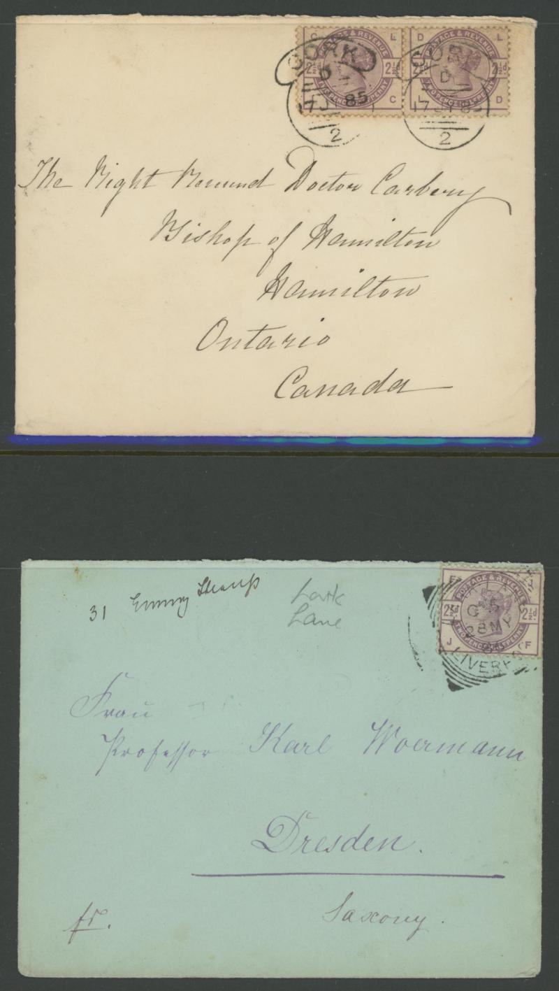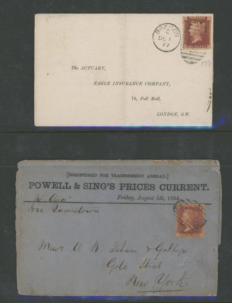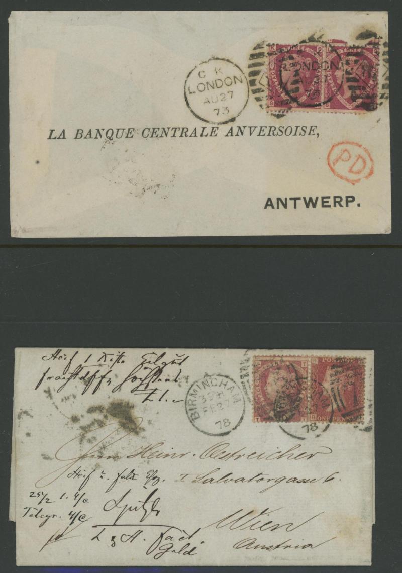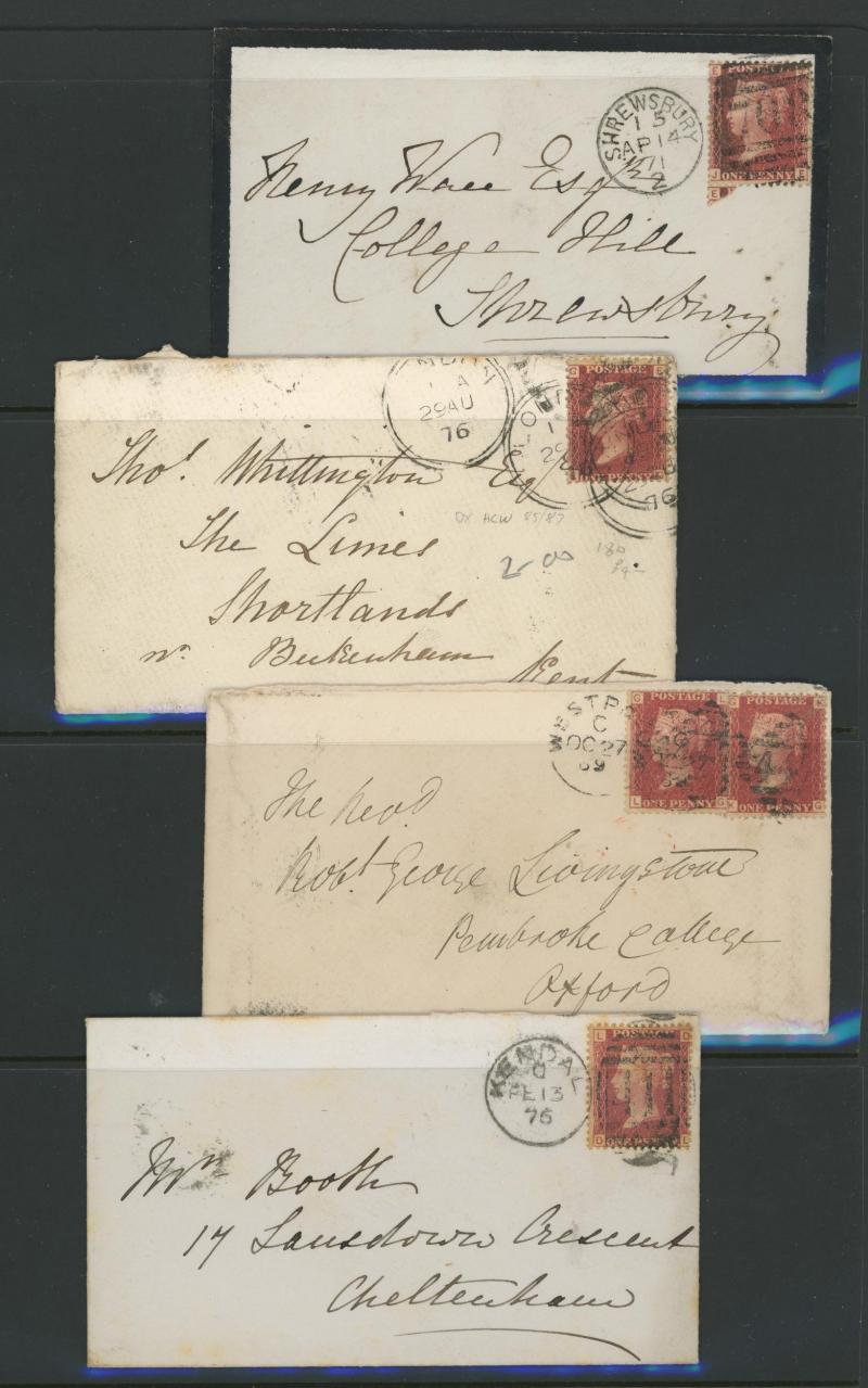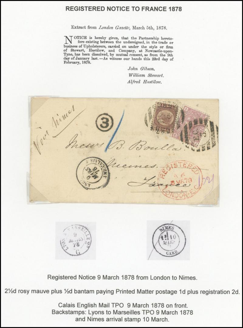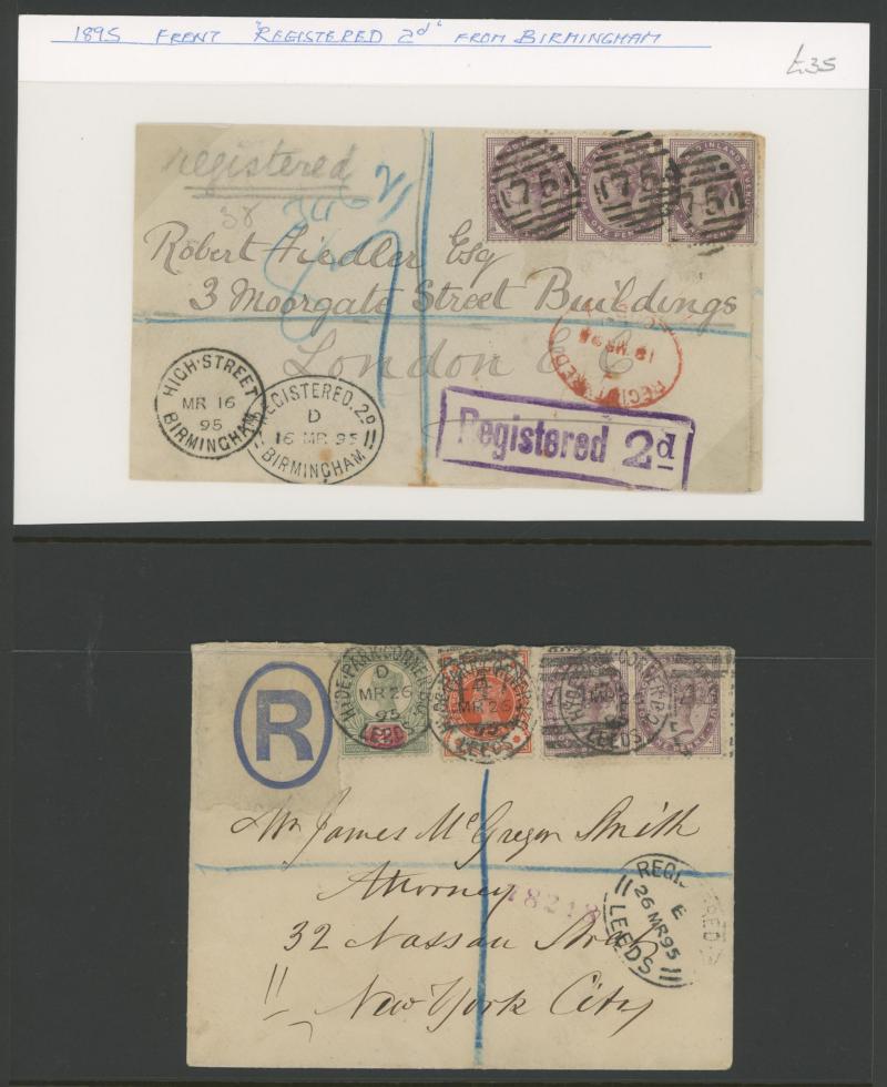 'L1' boxed cachet in red, 1878 to Germany with ½d Plate 10 block of 4 plus Line-Engaved Letters 1d, 1878 to USA single with Letters 2d blue, 1878 folded notice registered to France with ½d plus Surface-Printed 2½d rose for 1d printed matter rate plus