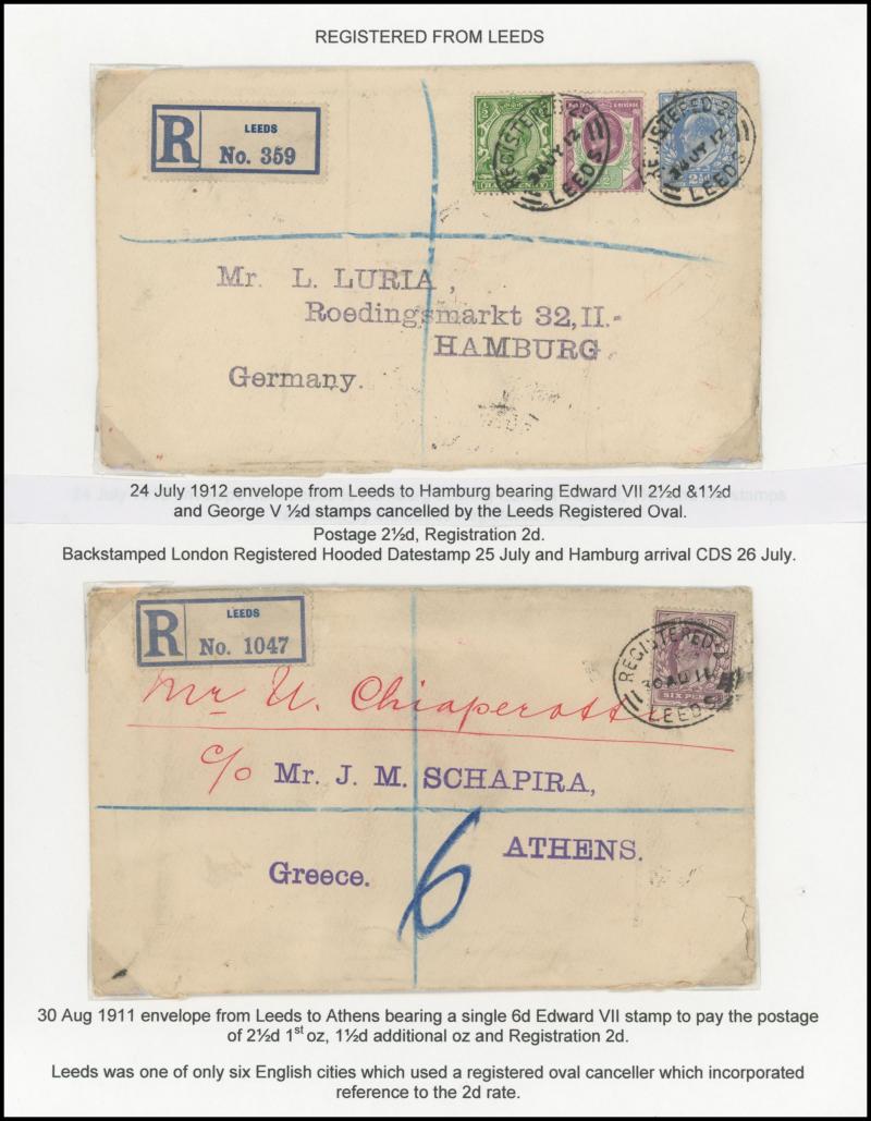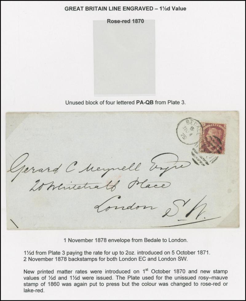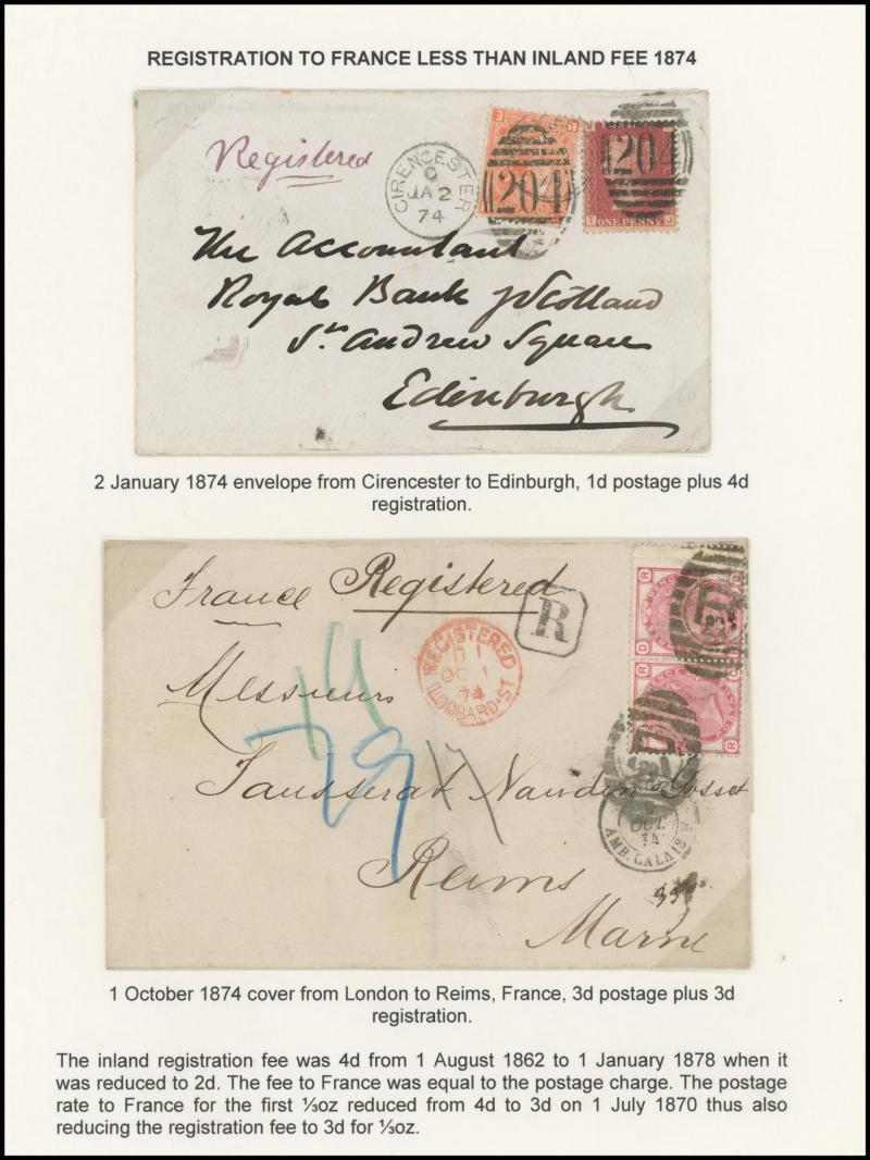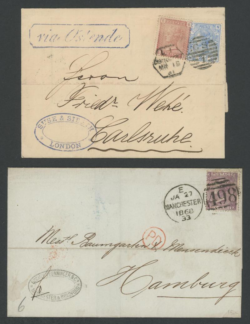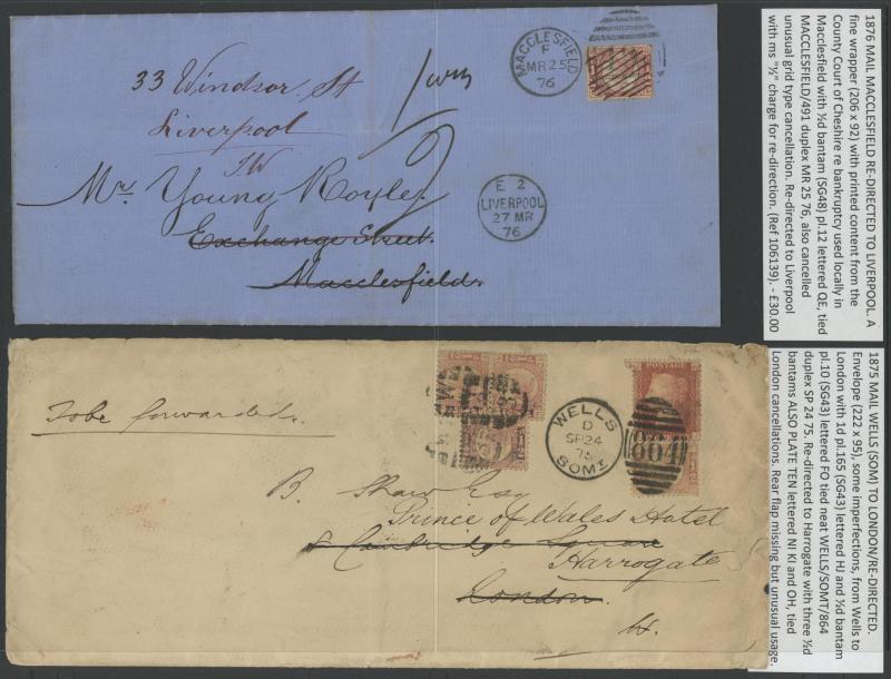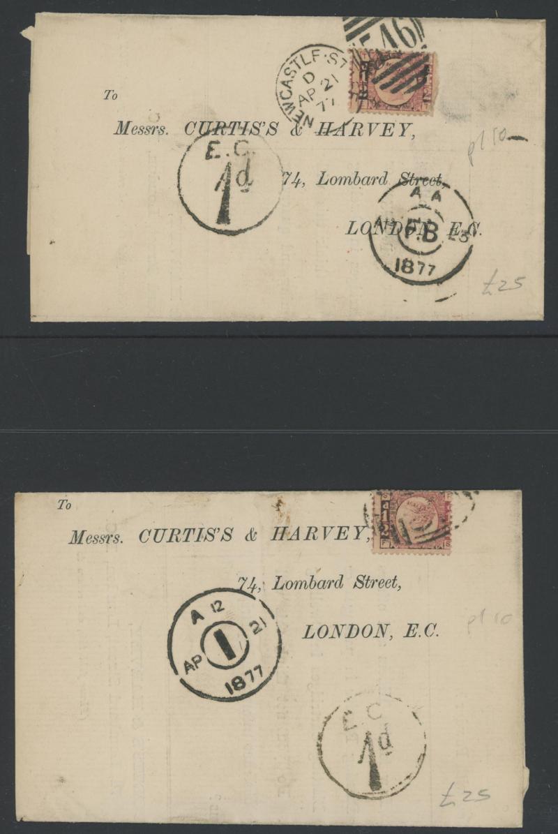 'L1' boxed cachet in red, 1878 to Germany with ½d Plate 10 block of 4 plus Line-Engaved Letters 1d, 1878 to USA single with Letters 2d blue, 1878 folded notice registered to France with ½d plus Surface-Printed 2½d rose for 1d printed matter rate plus