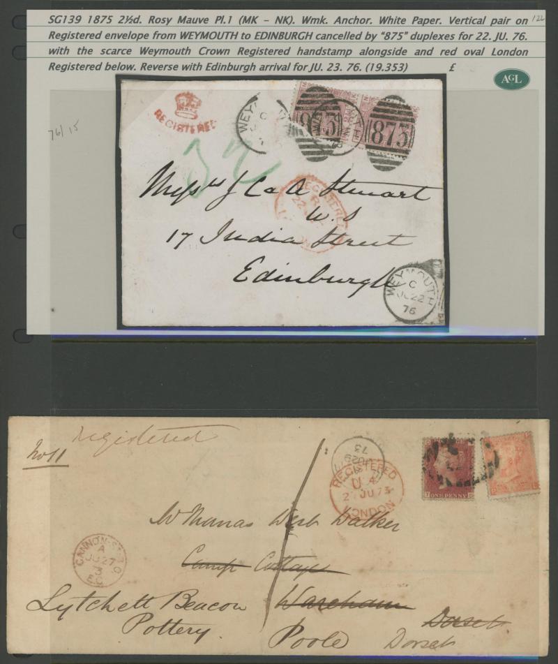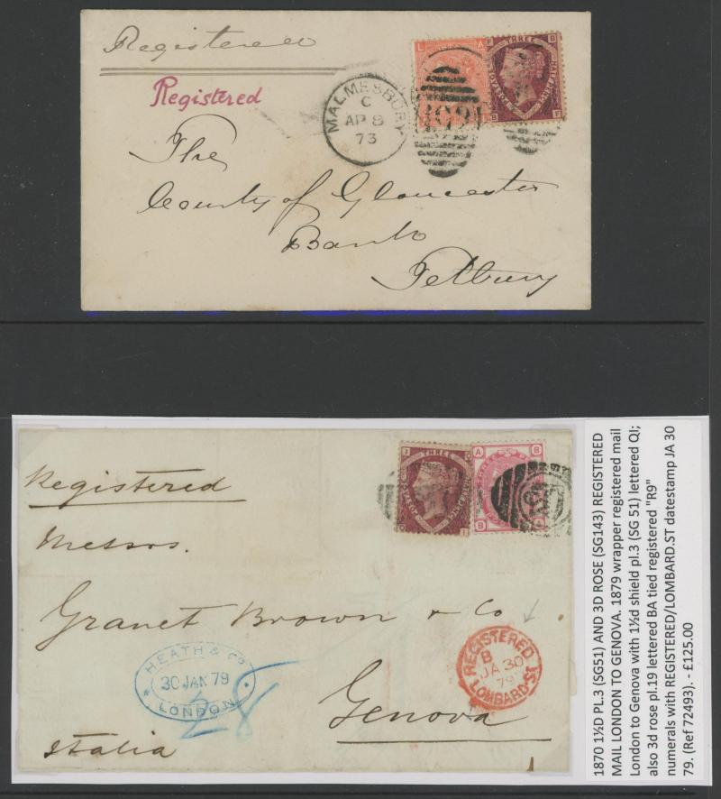 corner) and London 'PD' [Paid to Destination] cachet, 1873 registered to Tetbury with 1½d plus QV Surface-Printed Large Uncoloured Corner Letters 4d pale red, 1875 to Malta "Via Italy" with 1½d plus Large Coloured Corner Letters 2½d rose for the