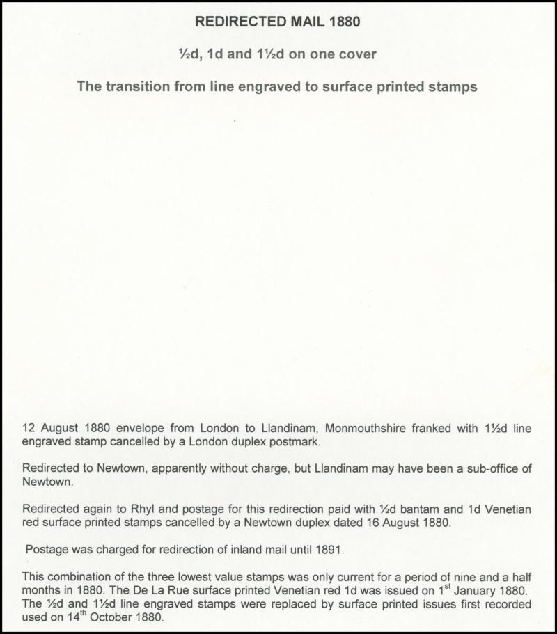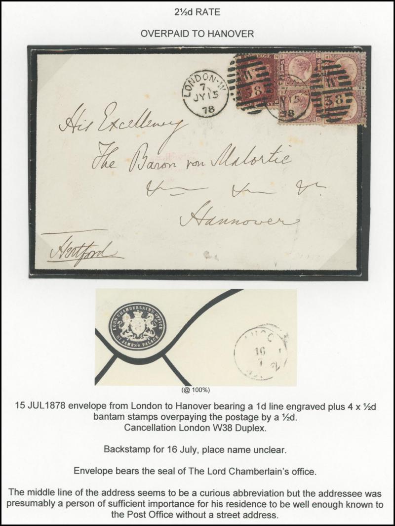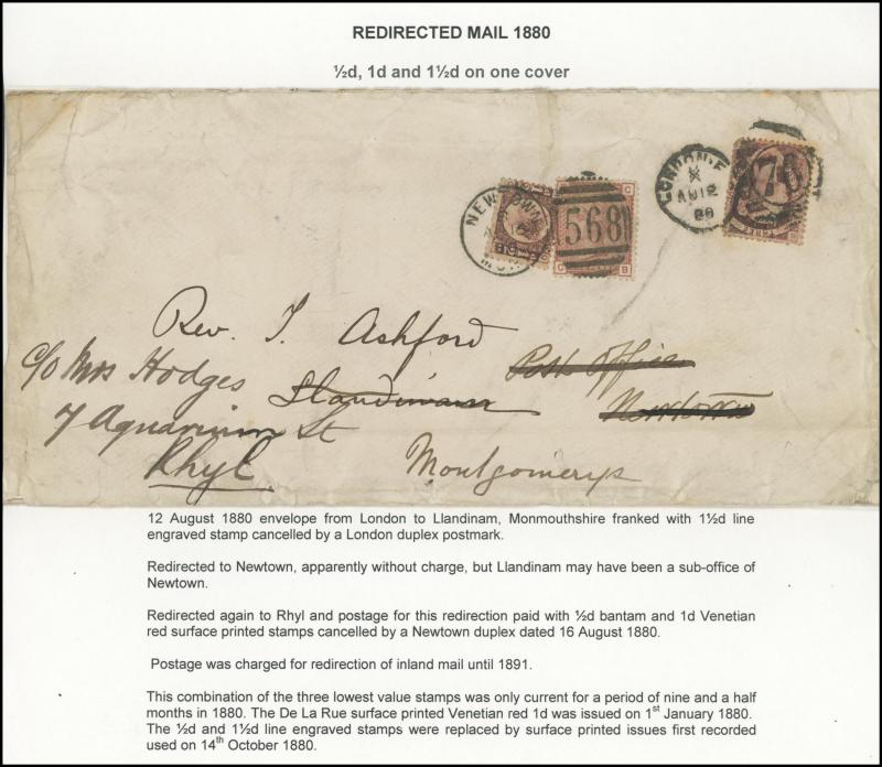 UPU letter rate and 1881 to Germany with 1½d x3 plus ½d green for double rate, 1880 solo London to Llandinam, Wales re-posted to Rhyl with ½d Bantam & 1d Venetian red added, 1880 to Germany with 1½d plus Letters 2d blue presumably from 2½d rate plus