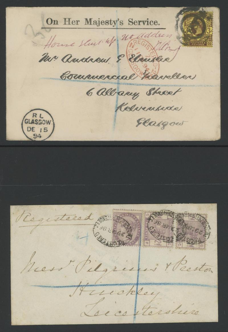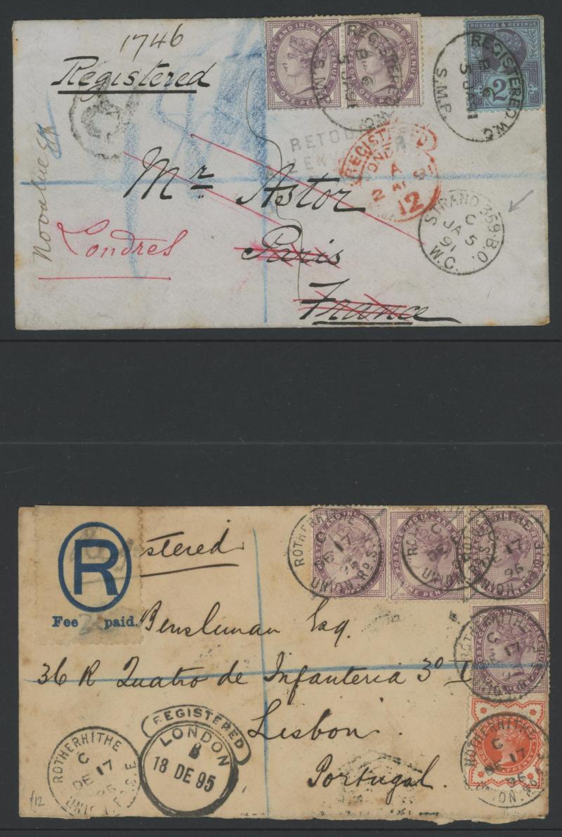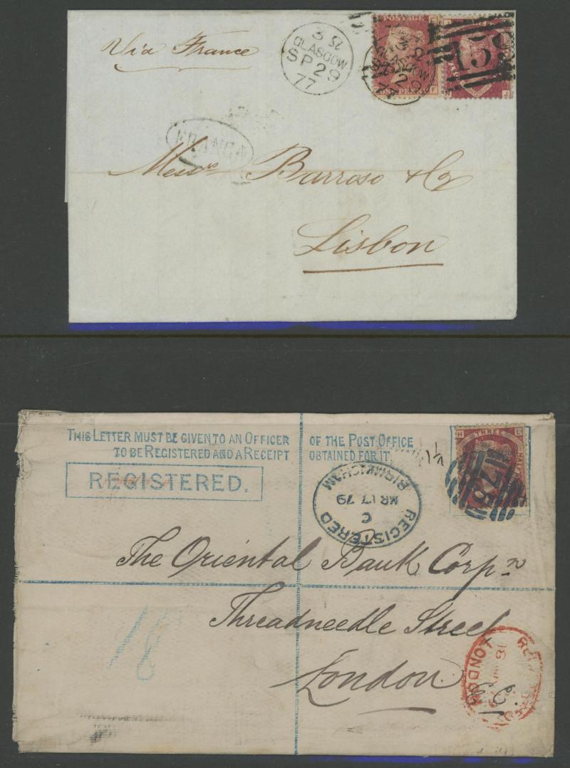post-UPU interim rate, 1877 to Portugal with 1½d plus Letters 1d tied Glasgow duplex for 2½d foreign letter rate and 'FRANCA' cachet, 1878 registered to Denmark with 1½d plus Large Coloured Corner Letters 3d rose tied by Scottish 'MONTROSE - 251'
