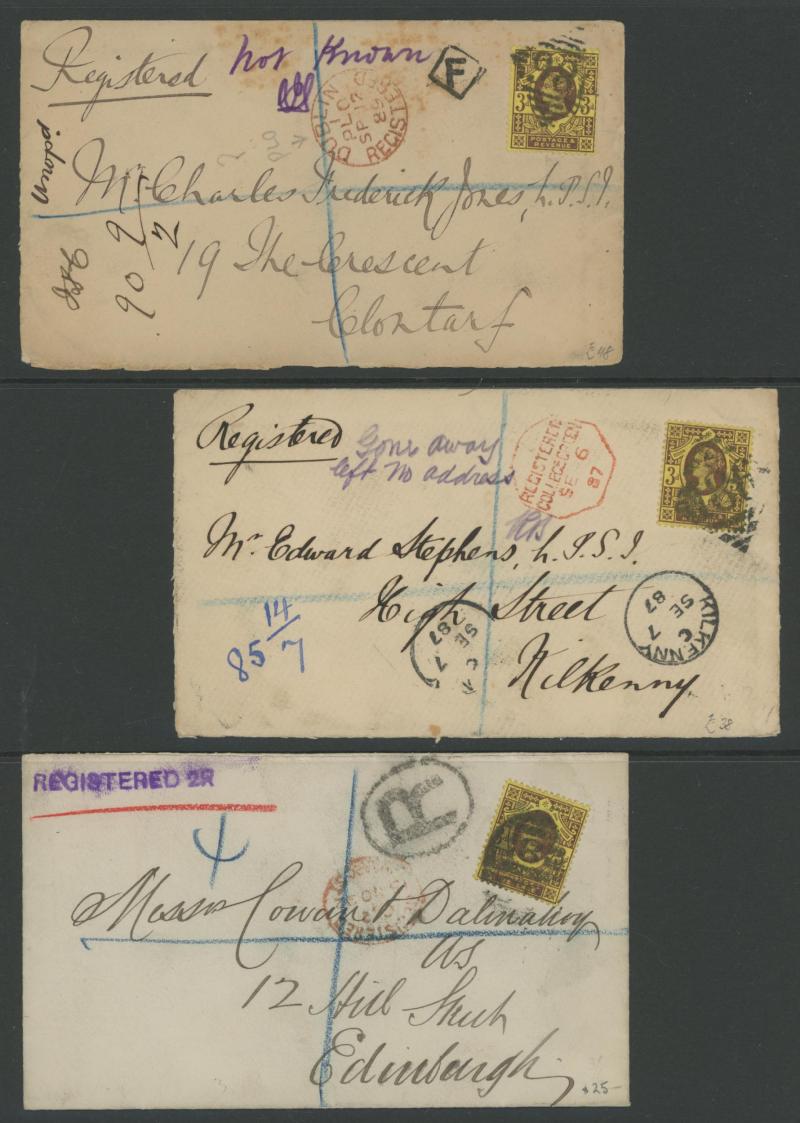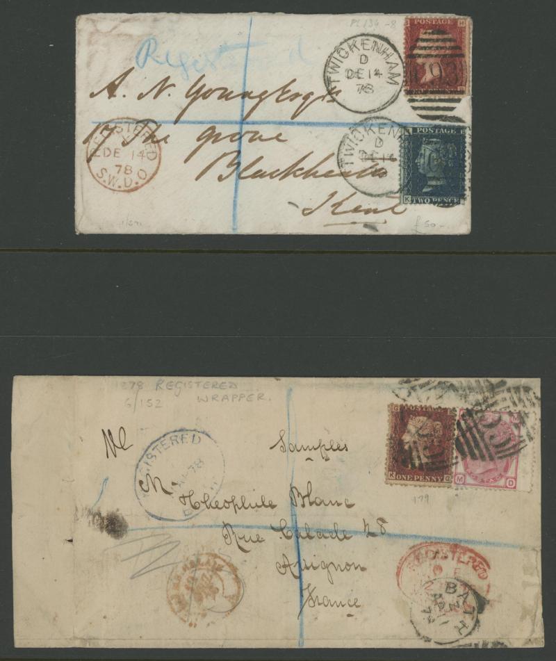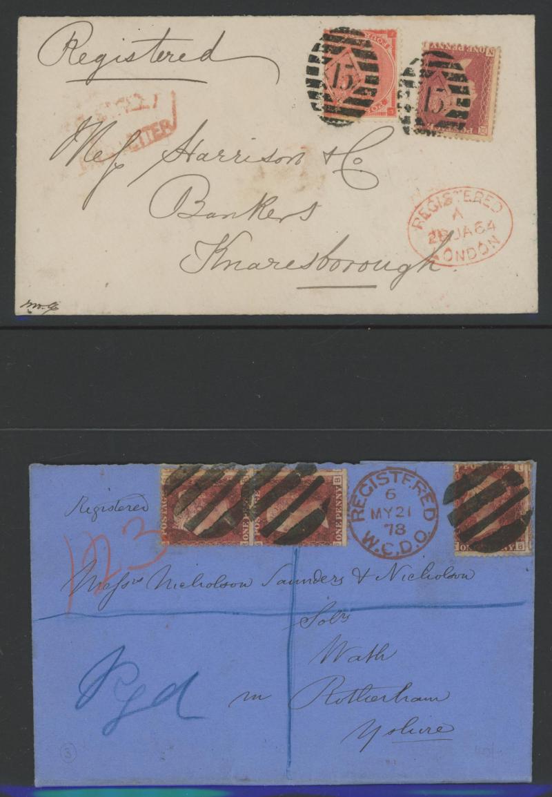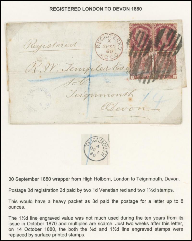 duplex cancels, 1878 solo on printed matter rate envelope (up to 2oz) from Bedale to London, 1879 on QV Registration Envelope from Birmingham to London, 1880 registered to Devon with 1½d pair & 1d Venetian red pair for 3d letter rate (up to 8oz) plus