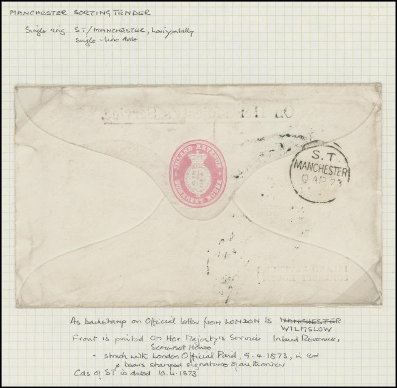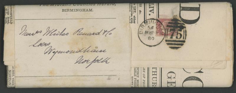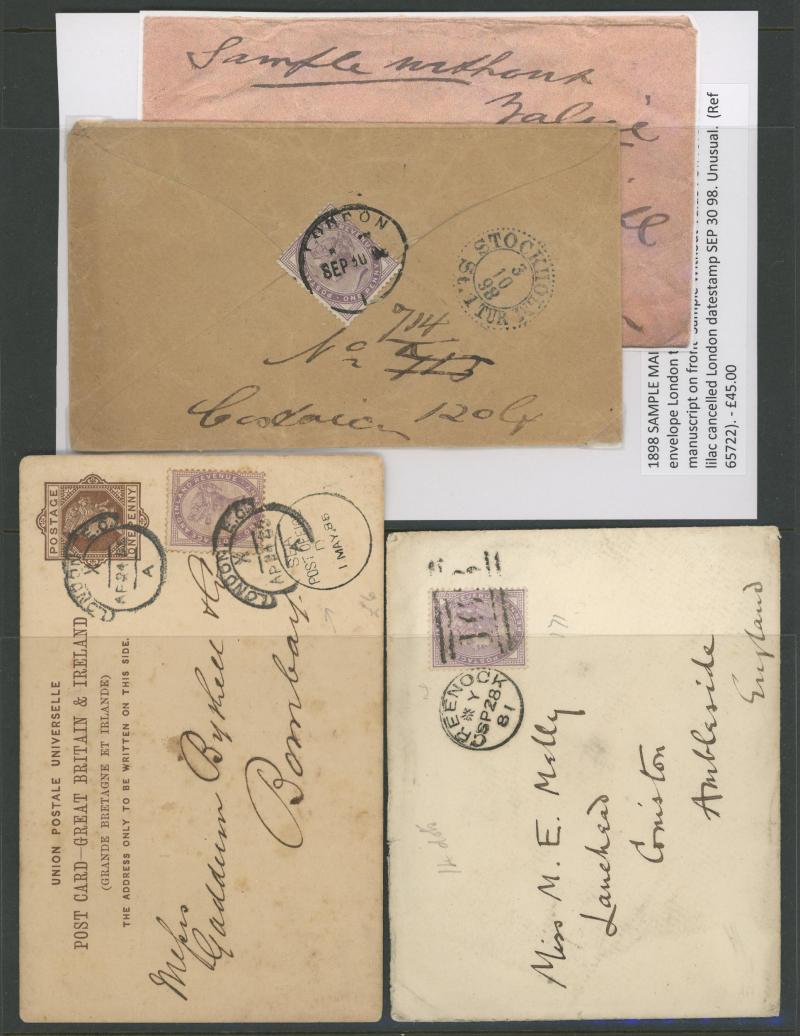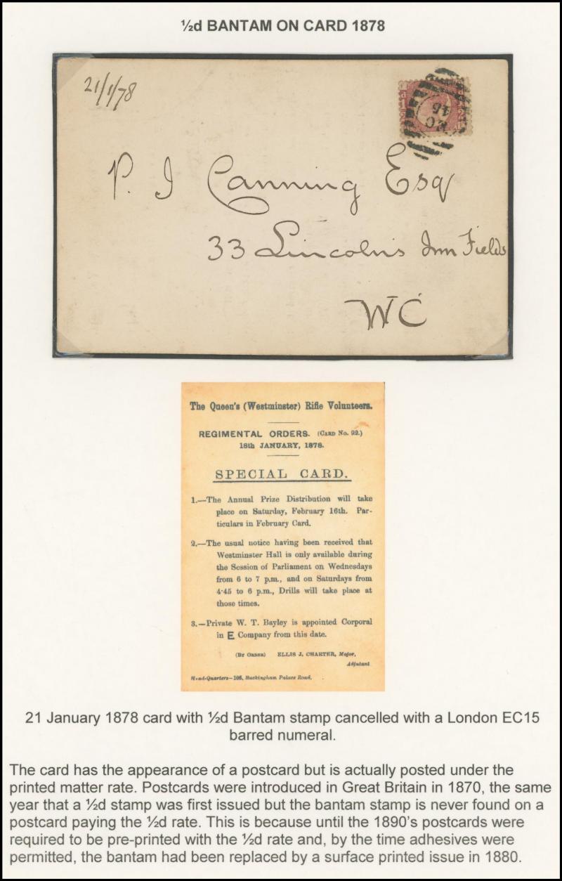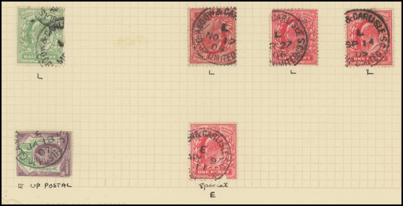 and London Inland Section Inspector Mark 'A12/AP/ I /21/1877' double-ring cds, 1878 'The Queen's (Westminster) Rifle Volunteers' postcard with London District 'EC/15' bars cancel, 1879 'Bankruptcy Act' notice used within Birmingham, 1880 on Midland